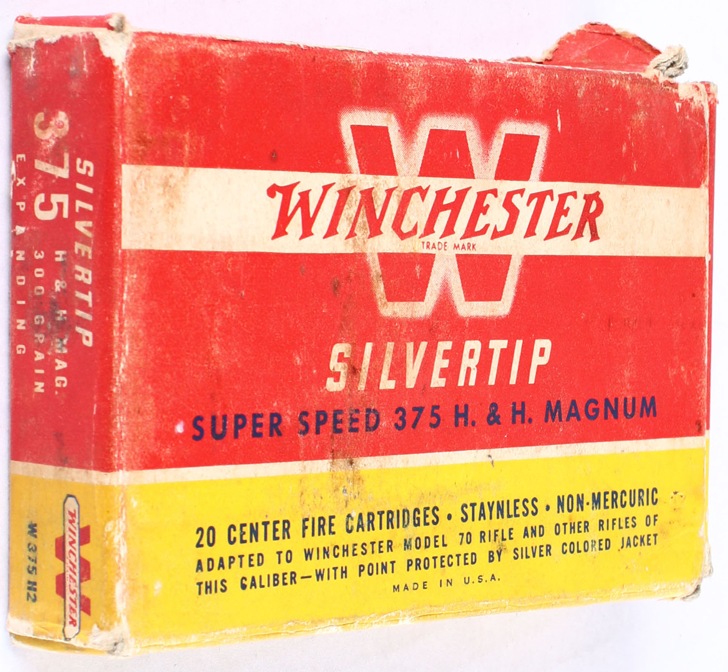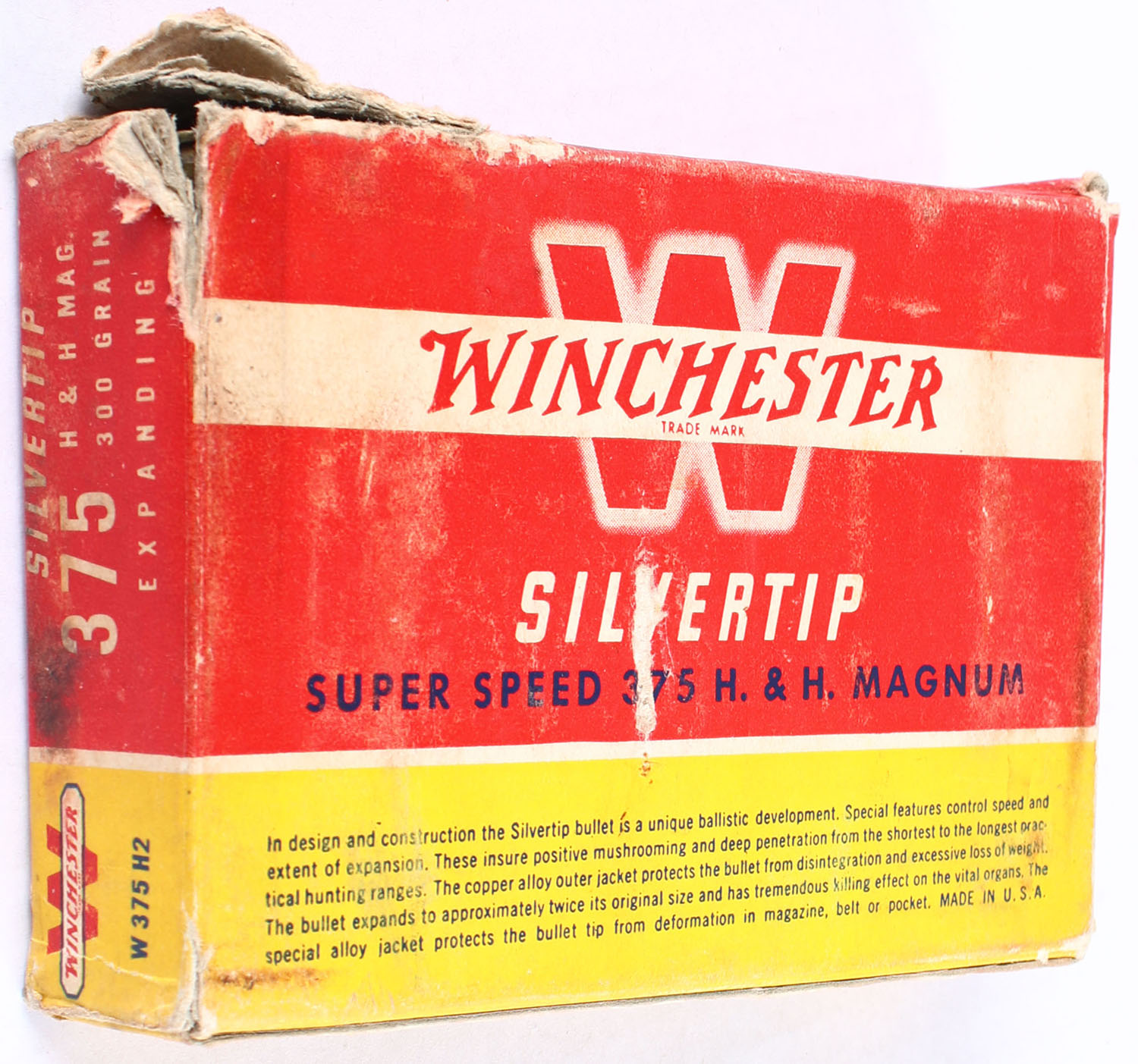 Winchester, Silvertip, 375 H. & H. Magnum, 300 Grain Expanding, Full, 1pc. Red yellow & white box, box has age soiling with scuffing, has edge & corner wear, has a partial seam split to top corner, ammo is good. Grade: Fair ++ - Value: 50 to 75