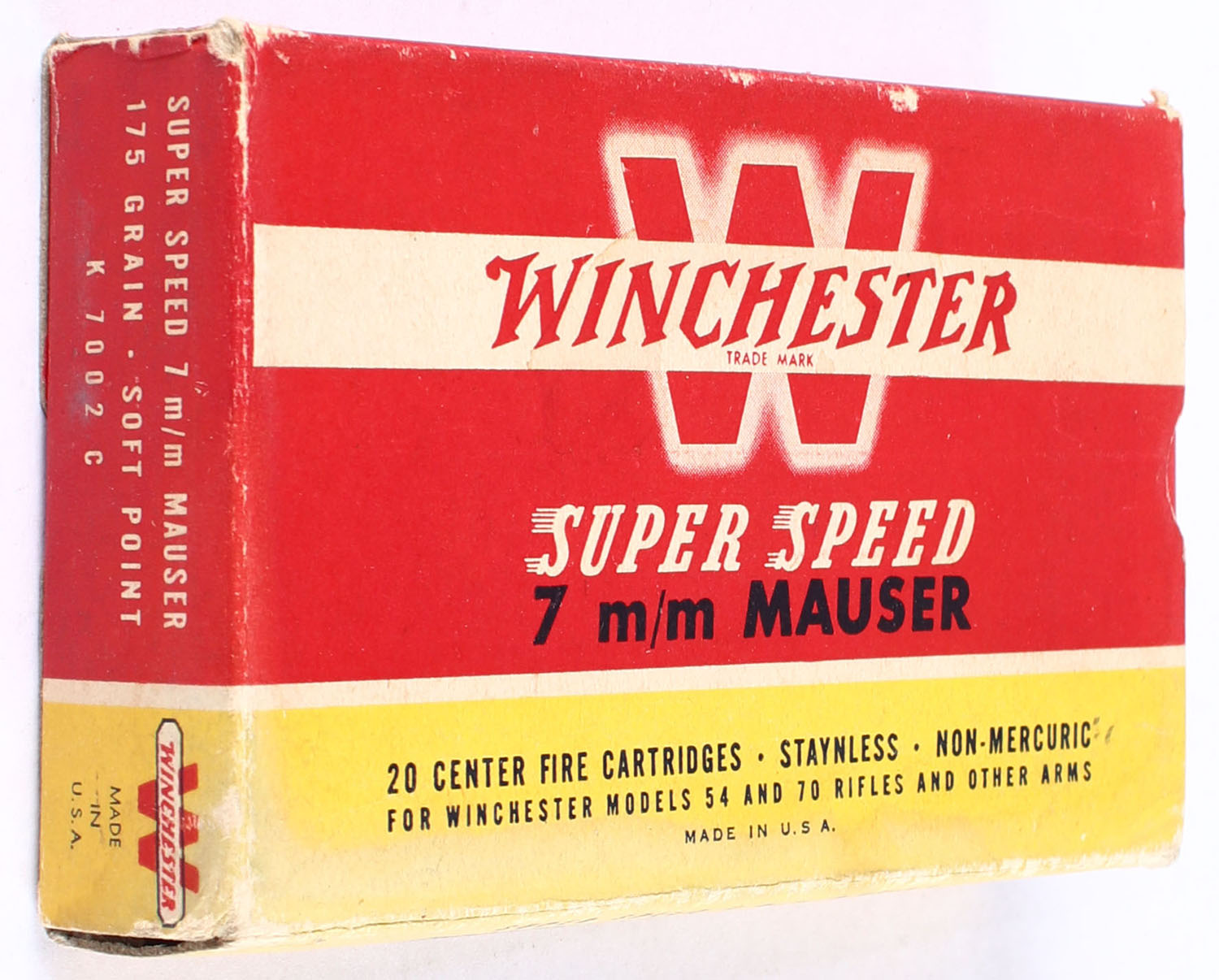 Winchester, Super Speed, 7mm Mauser, 175 Grain Soft Point, Full, 1pc. Red yellow & white box, box is solid with very good color, minor shelf wear, some corner wear, end flaps are solid, ammo is excellent. Grade: Very Good - Value: 20 to 30