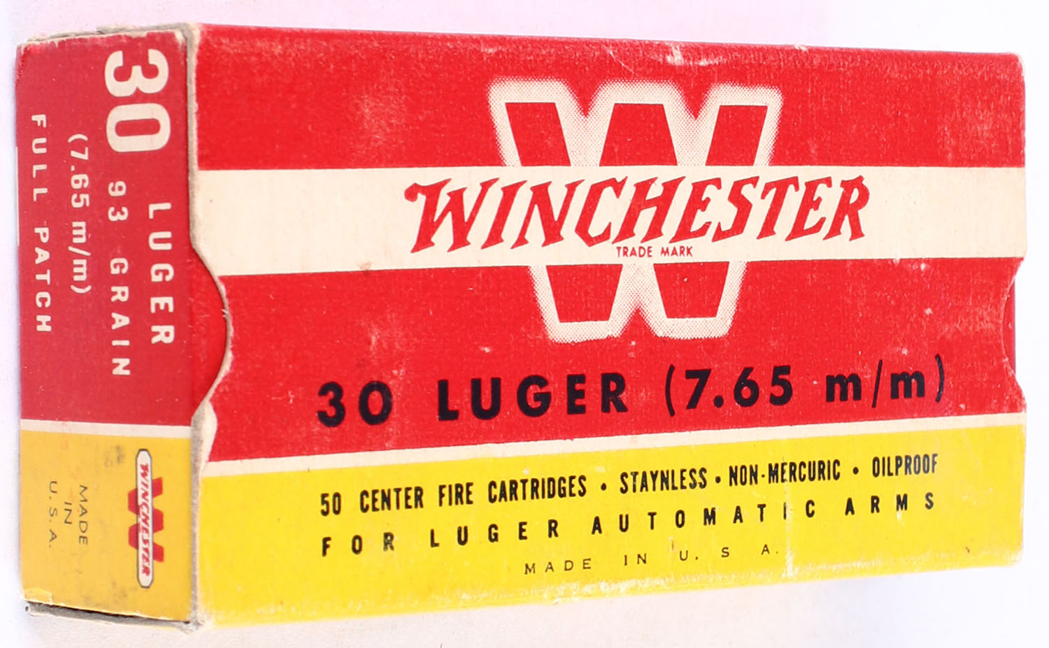 Winchester, Center Fire Cartridges, 30 Luger (7.65 m/m), 93 Grain Full Patch, 1pc. Red yellow & white box, box is very solid with minor scuffing, corners are sharp edges are crisp, ammo is excellent. Grade: Excellent - Value: 20 to 40