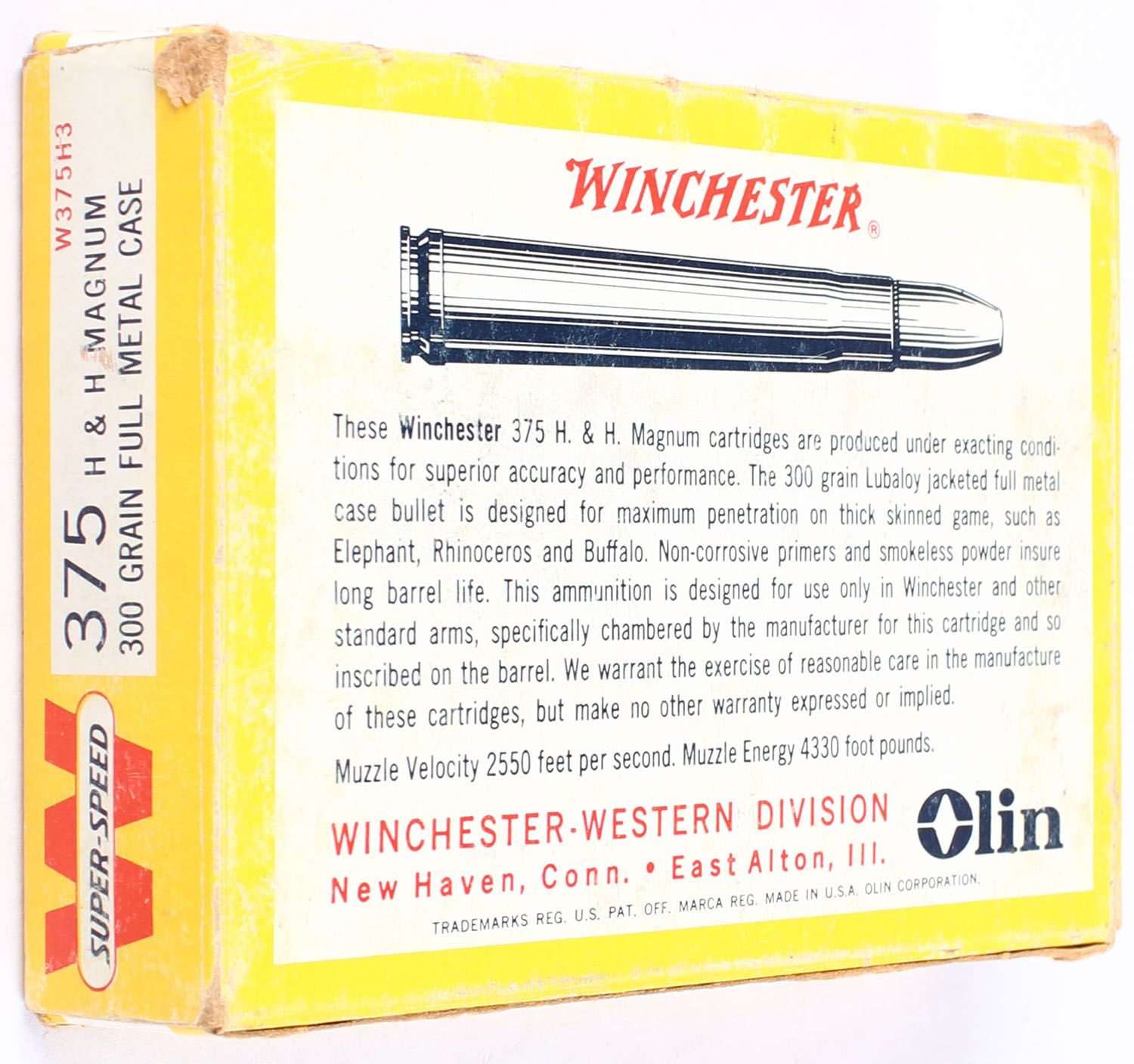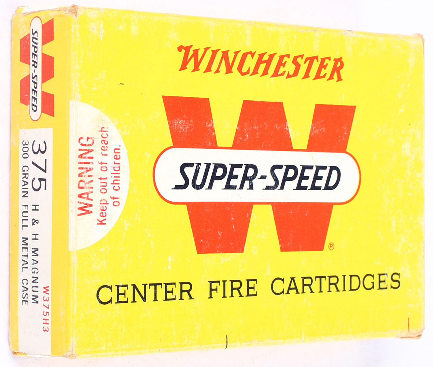 Winchester, Center Fire Cartridges, .375 H&H Magnum, 300 Grain Full Metal Bullet, Full, 1pc. Yellow white & red box, box has minor scuffing, light shelf wear, some edge & corner wear, end flaps are solid, ammo is excellent. Grade: Very Good ++ - Value: 60 to 90