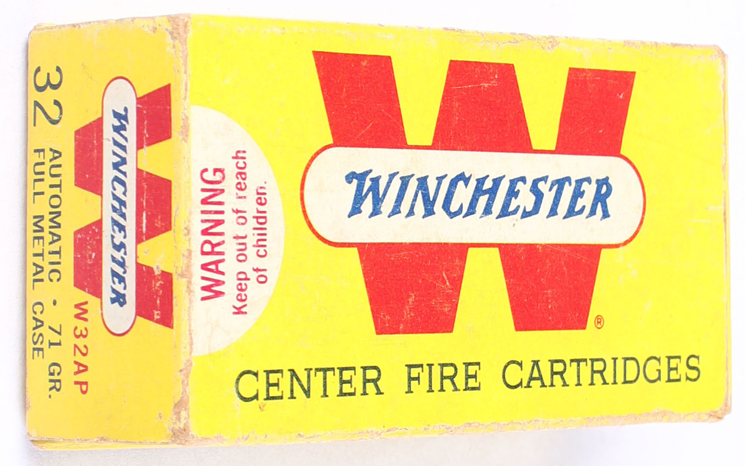 Winchester, Center Fire Cartridges, .32 Automatic, 71 Grain Full Metal Case, Partial 44rds, 1pc., Yellow white & red box, box has some shelf wear with light scuffing, end flaps are solid, ammo is excellent. Grade: Very Good - Value: 20 to 30