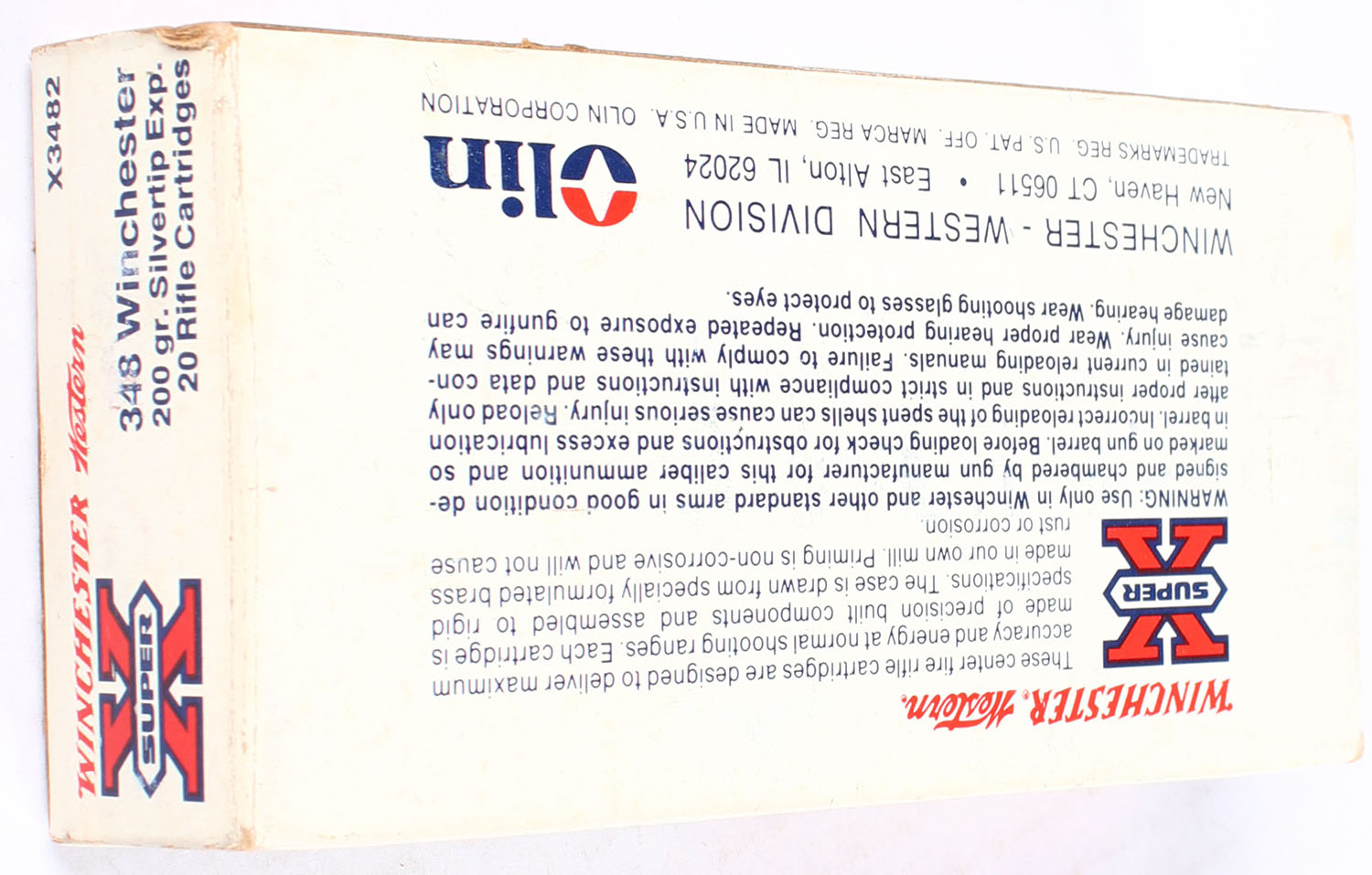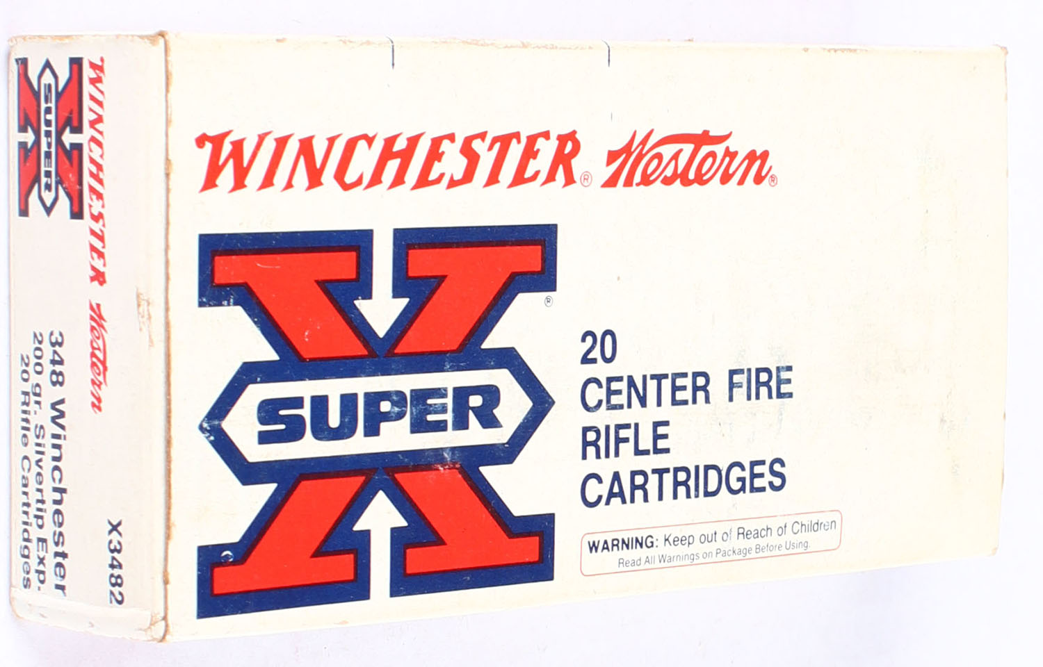 Winchester-Western, Super X, 348 Winchester, 200 Grain, Silvertip Exp., Full, 1pc, White red & black box, box has some shelf wear, end flaps are solid, ammo is excellent. Grade: Very Good + - Value: 50 to 75