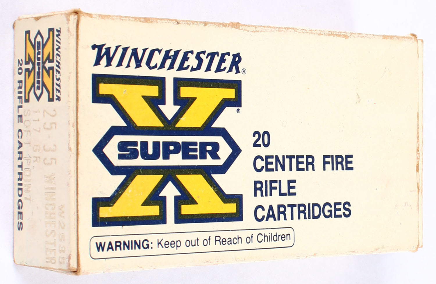 Winchester, Super X, 25-35 Winchester, 114 Grain, Full, 1pc. White & yellow box, box is solid with light age soiling & edge wear, end flaps are solid, ammo is excellent. Grade: Very Good - Value: 60 to 90
