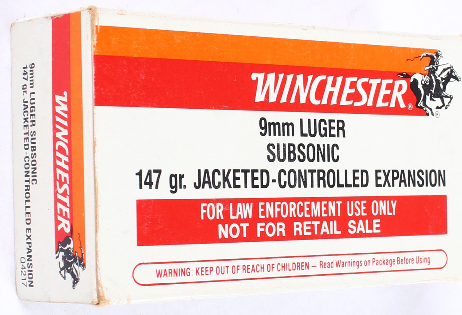 Winchester, Luger Subsonic, 147 Grain Jacketed-Controlled Expansion, Full, 1pc. Grey red & orange box, box is very solid with excellent color, has very minor corner wear, end flaps are solid, ammo is excellent. Grade: Excellent - Value: 20 to 30
