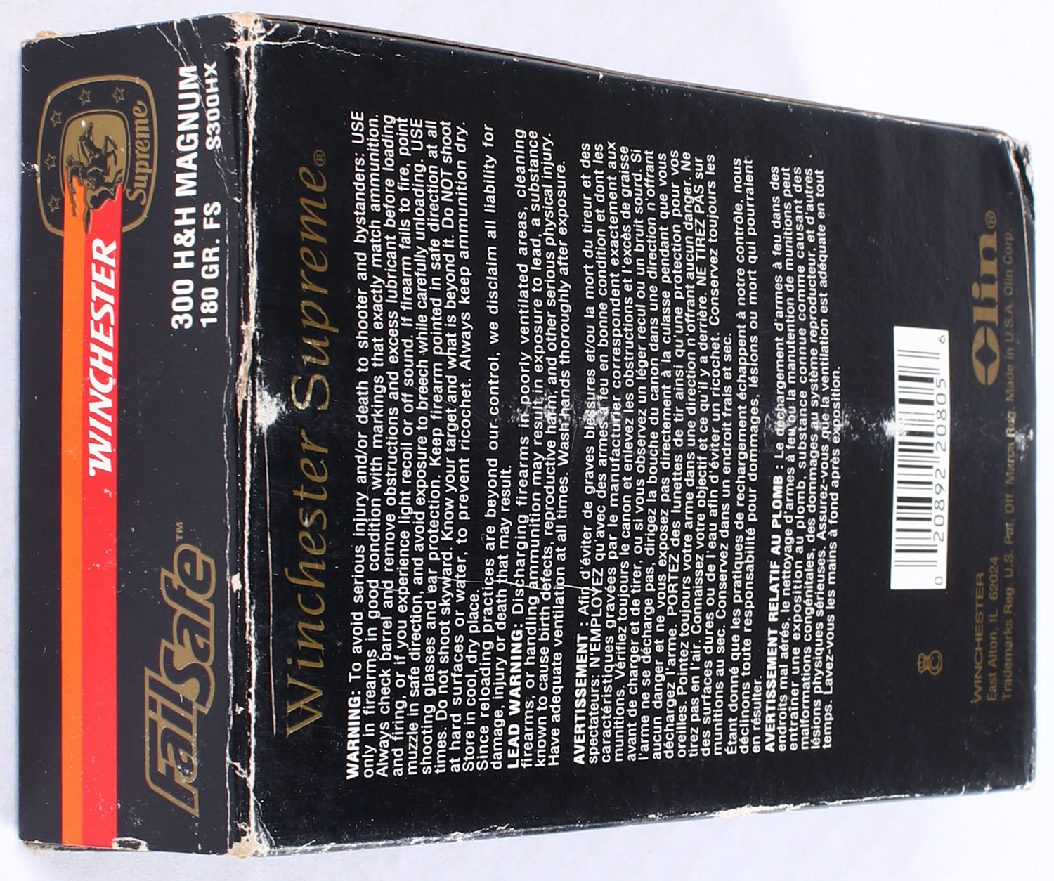 Winchester, Supreme FailSafe, 300 H & H Magnum, 180 Grain F.S., Black box with gold, white, orange & red print, box has rub marks with edge & corner wear, has sticker residue on front, end flaps are sold, ammo is excellent. Grade: Very Good ++ - Value: 24 to 36