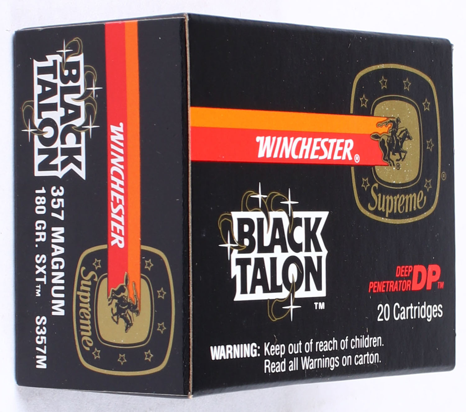 Winchester, Black Talon, .357 Magnum, 180 Gr. SXT, Full, 1pc. Black red & orange box, box is solid with excellent to minty color, minor shelf & corner wear, edges are crisp, end flaps are solid, ammo is minty. Grade: MINT - Value: 90 to 120