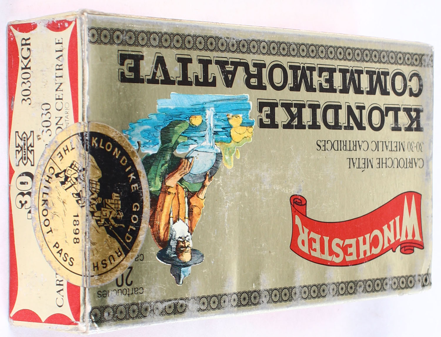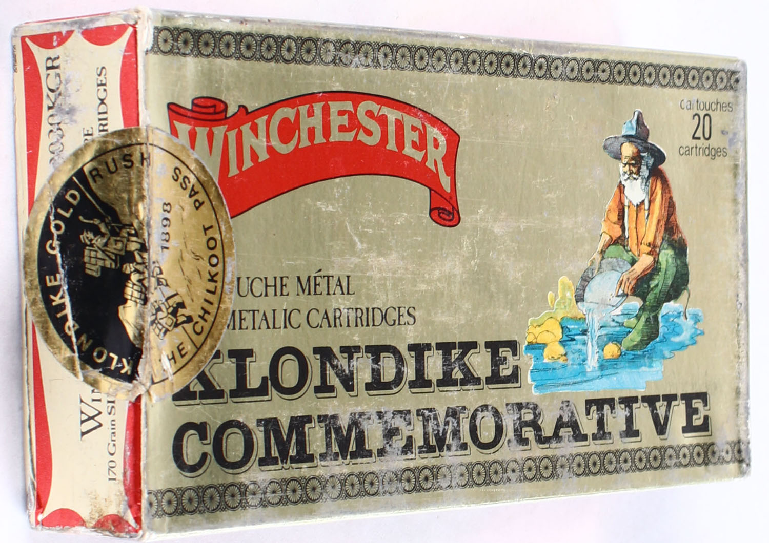 Winchester KLONDIKE COMMEMORATIVE 30-30 Metallic Cartridges, 170 Grain Silvertip, 1pc, Full, has seal on both ends that reads ''KLONDIKE GOLD 1898 THE CHILKOOT PASS'', box has rub marks with edge & corner wear, end flaps are solid, ammo is excellent. Grade: Very Good ++ - Value: 100 to 150