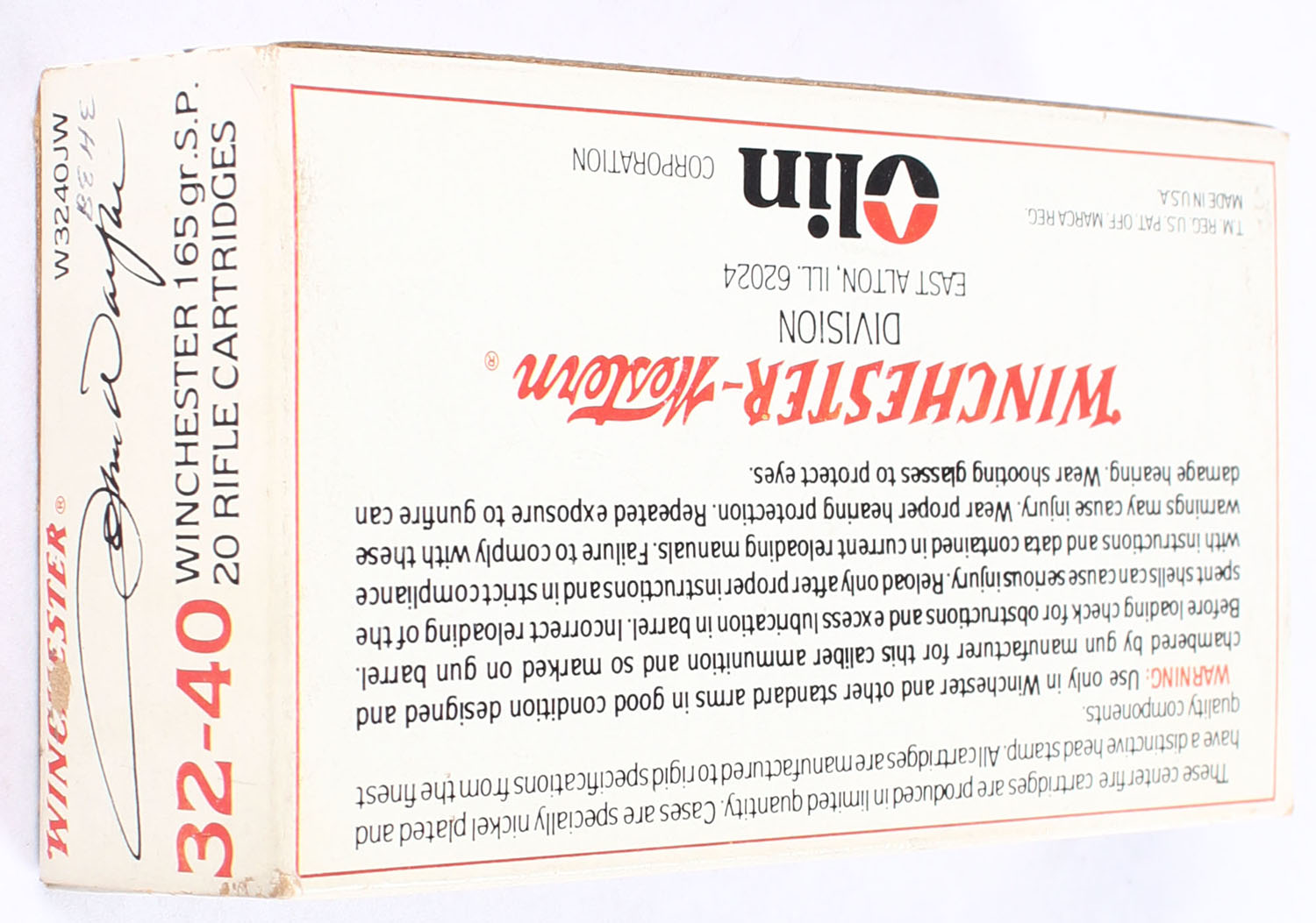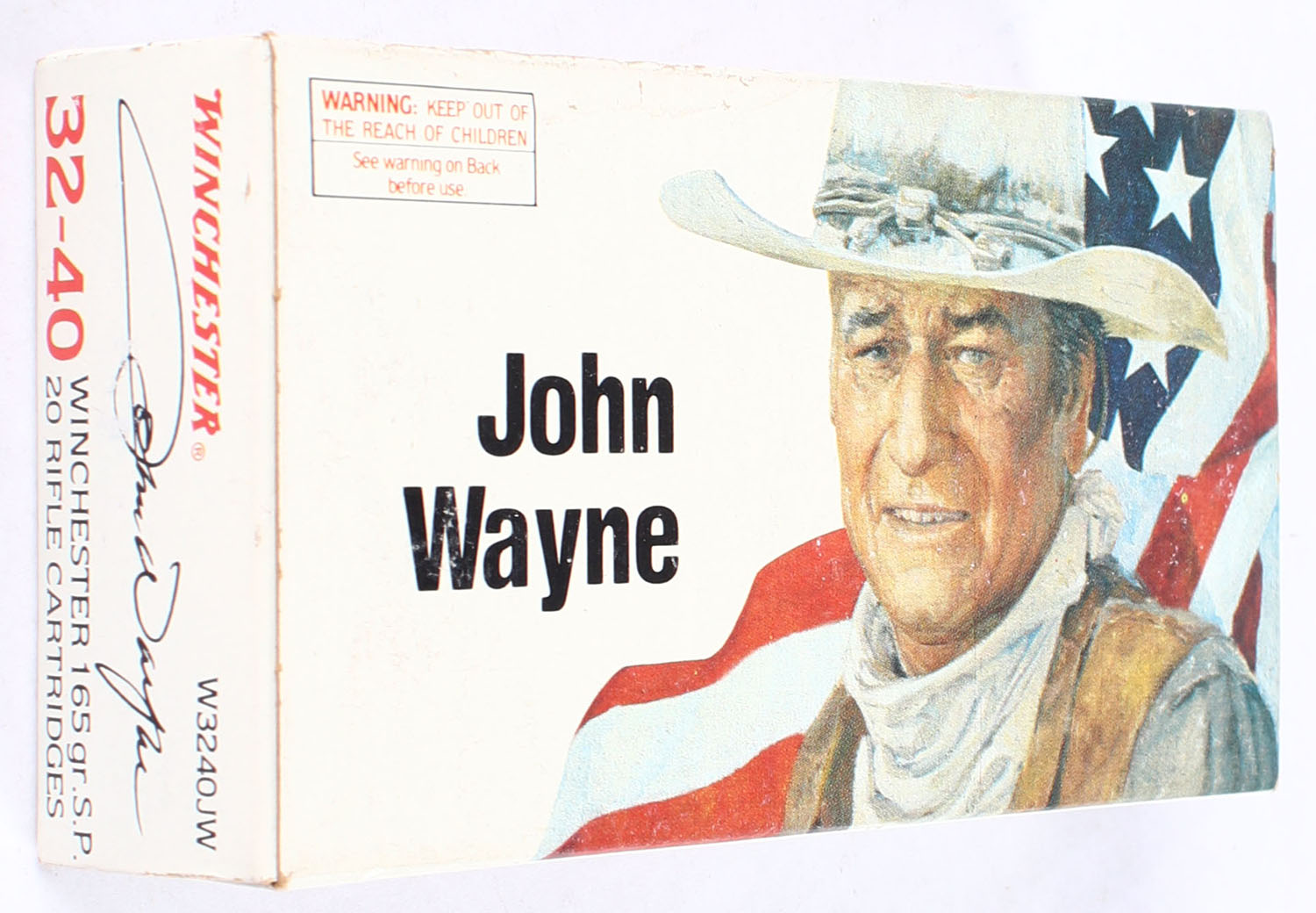 Winchester, John Wayne, .32-40 Winchester, 165 Grain Soft Point, Full, 1pc. White box featuring John Wayne, box is solid with excellent color, very minor edge & corner wear, end flaps are solid, ammo is minty. Grade: Excellent - Value: 80 to 120
