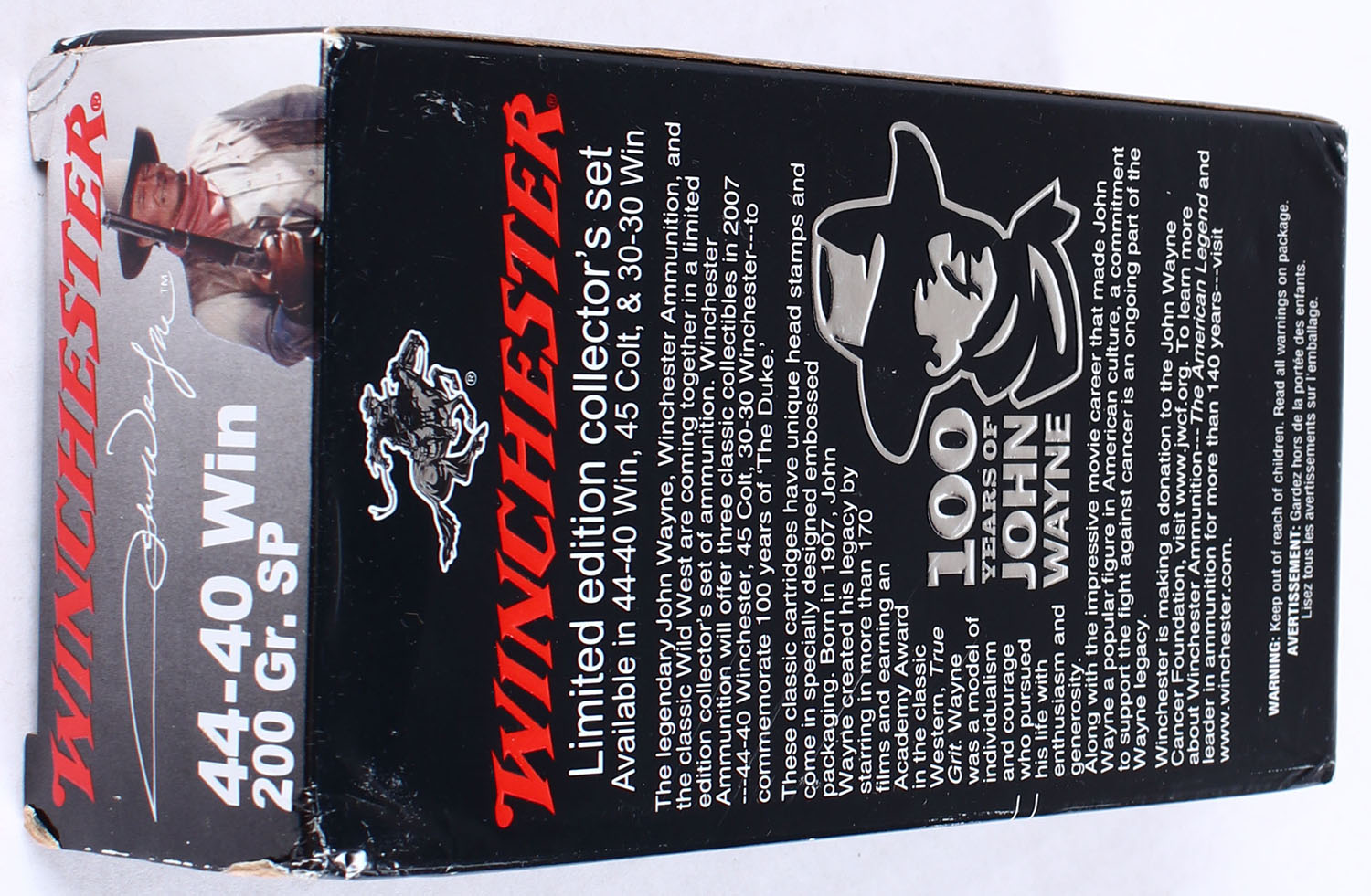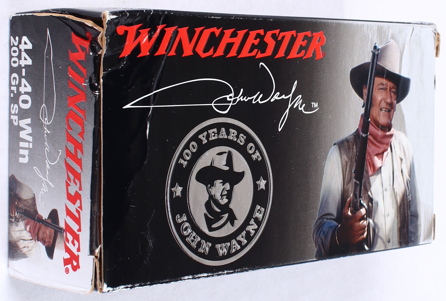 Winchester, 100 Years of John Wayne, .44-40 Winchester, 200 Grain Soft Point, Full, 1pc. Multi-colored box, box is very solid with excellent color, has some rub marks with corner wear, end flaps are solid, ammo is minty. Grade: Excellent - Value: 100 to 150