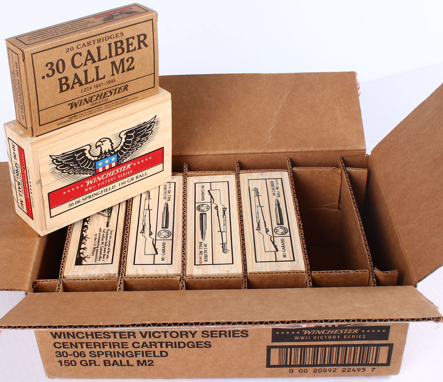 FULL CASE (5 boxes) of Winchester, WWII Victory Series, .30-06 Springfield, 150 Grain Ball, Full (100rds), 1pc., Multi-colored wooden boxes with brown boxes inside, wooden boxes are mint, inside boxes are mint, ammo is mint. Grade: MINT - Value: 300 to 450