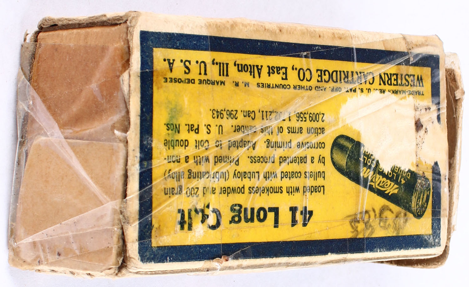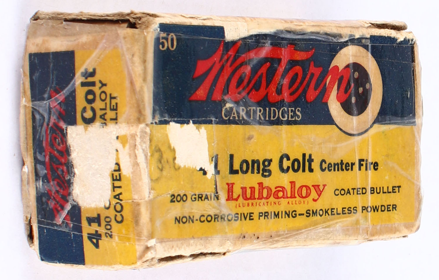 Western, Lubaloy Cartridges, .41 Long Colt, 200 Grain Lubaloy Bullet, 1pc, Full, Blue yellow & red box, box has seam splits with tape repairs, has missing right end flap, age soiling & edge wear, ammo is very good to excellent. Grade: Good - Value: 60 to 90