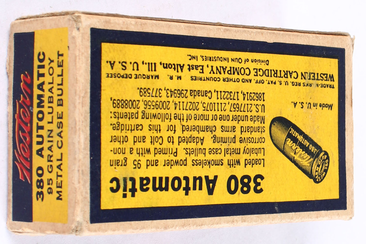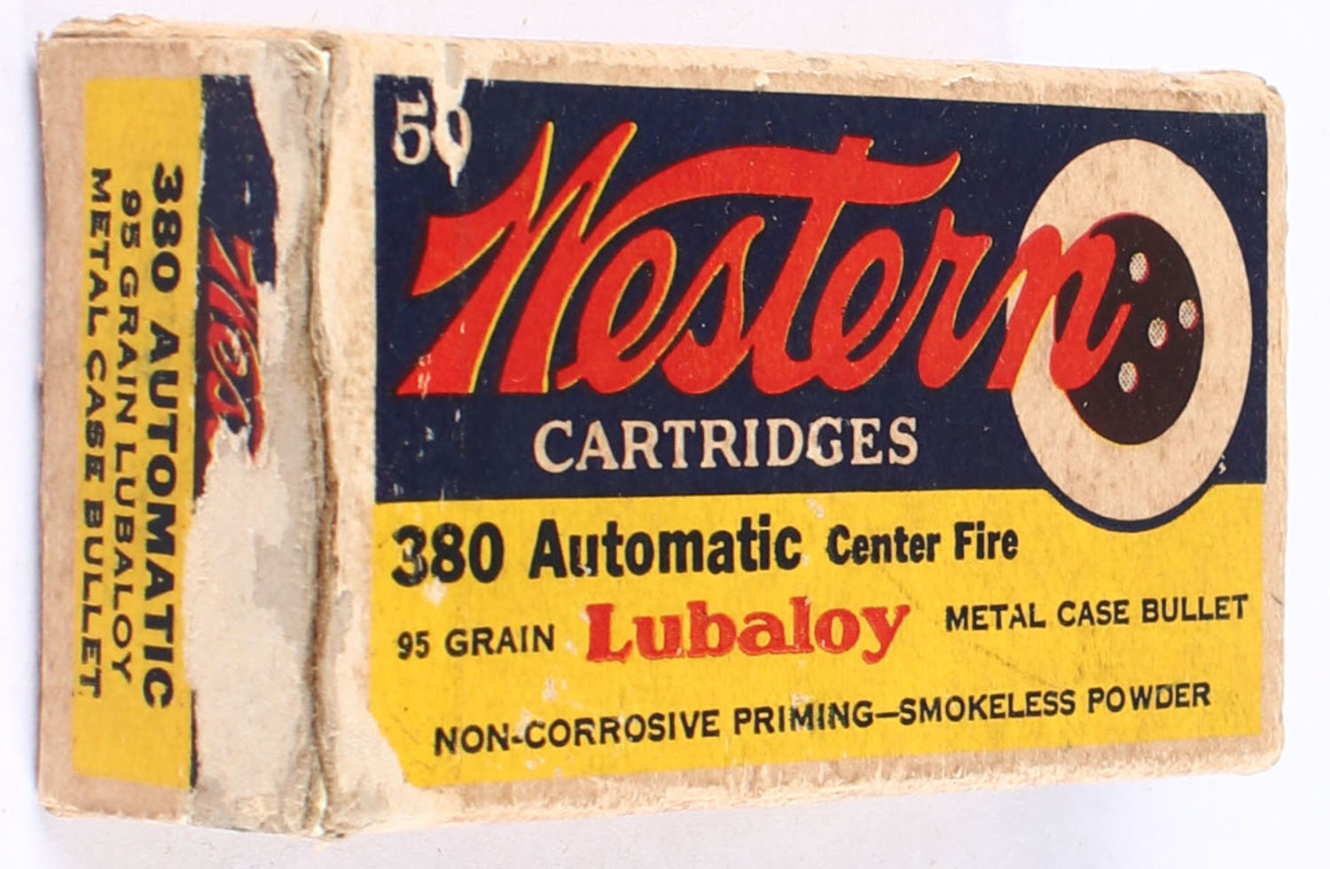 Western, Lubaloy Cartridges, .380 Automatic, 95 Grain Lubaloy Metal Case Bullet, Full, 1pc, Yellow blue & red bulls eye box, box has age soiling with edge & corner wear, has scuffing with good color, ammo is excellent. Grade: Very Good - Value: 30 to 45
