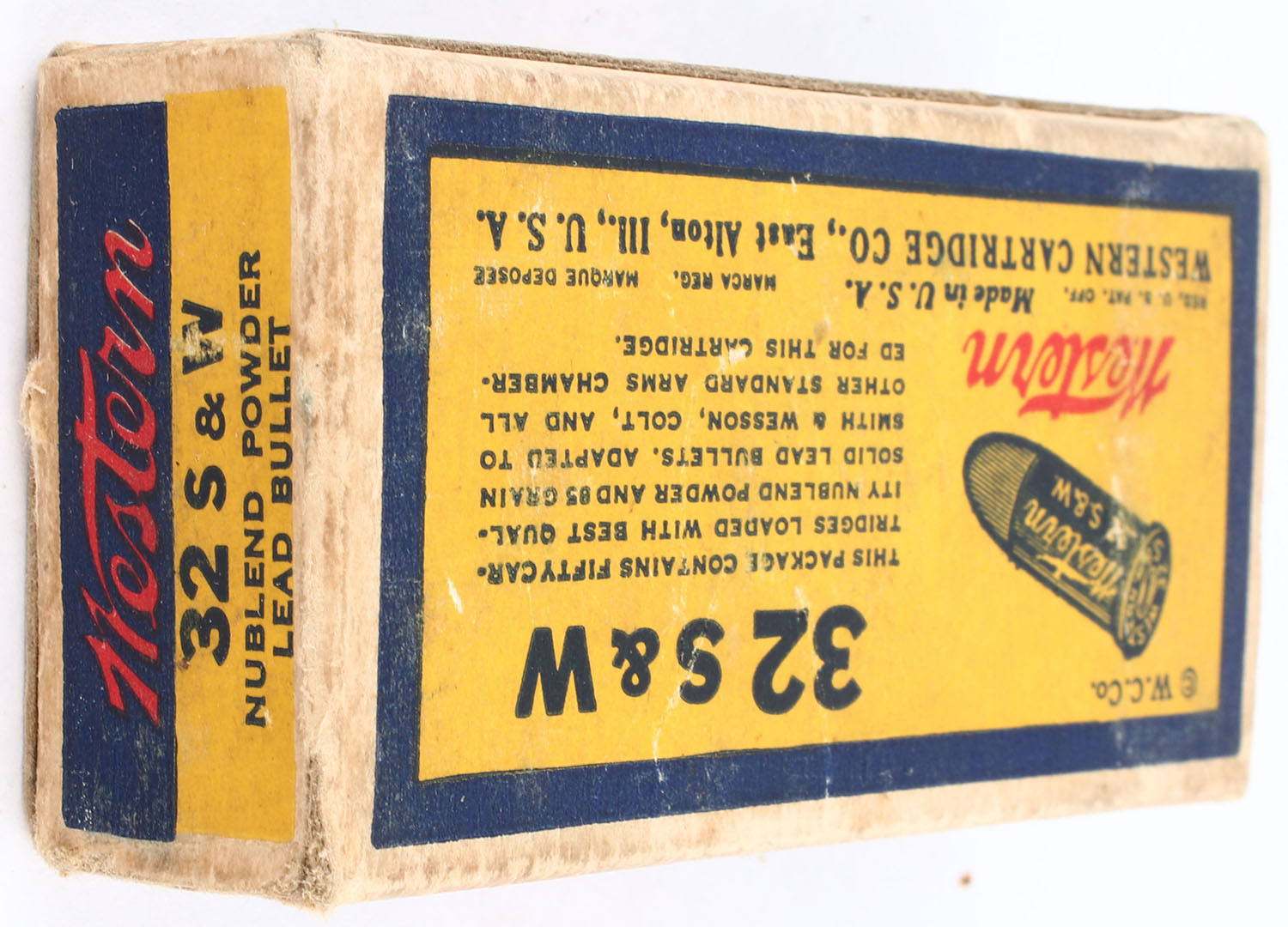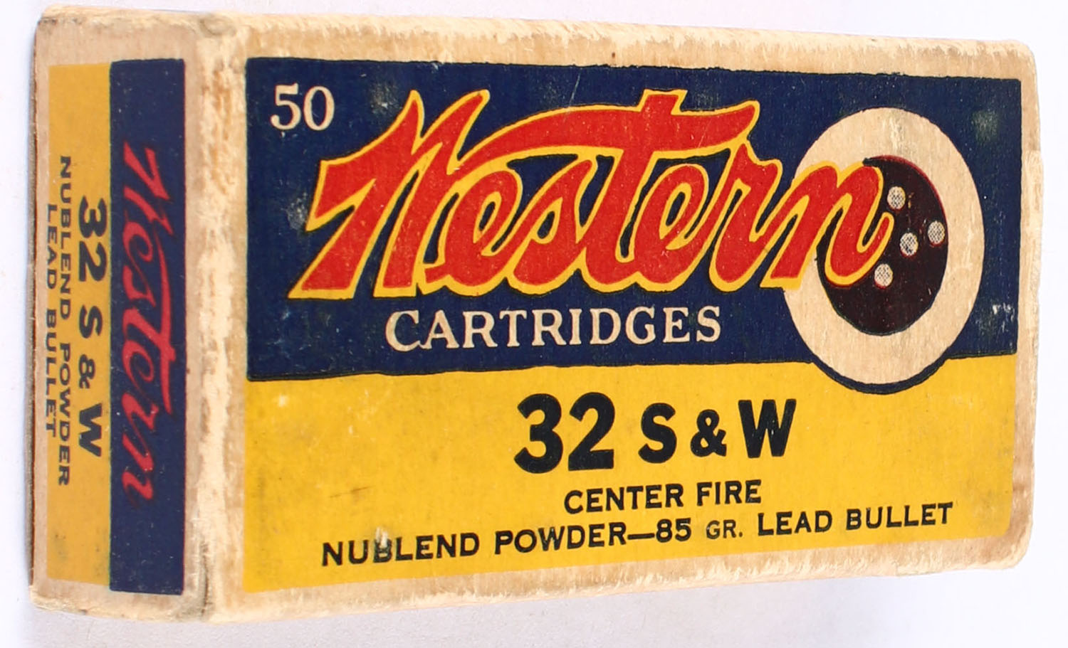 Western, Center Fire Cartridges, GHOST BOX, .32 Smith & Wesson, 85 Grain Nublend Powder Lead Bullet, Full, 1pc, Yellow blue & red bullseye box, box is missing right inside flap, has shelf wear with light edge & corner wear, ammo is excellent. Grade: Very Good - Value: 20 to 40