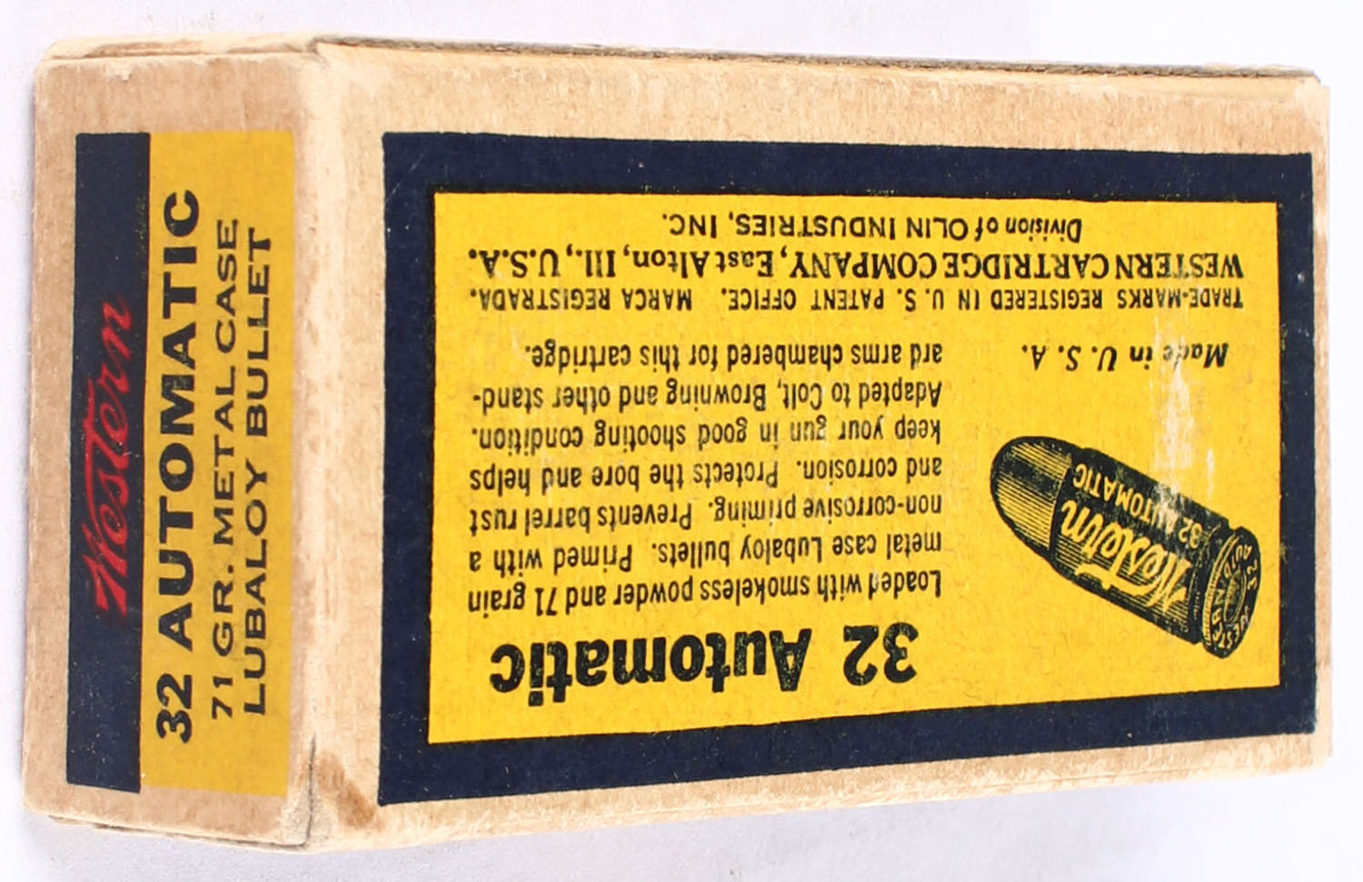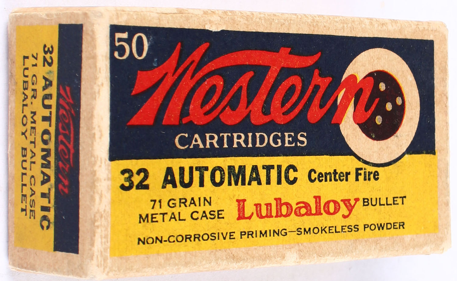 Western, .32 Automatic, 71 Grain Full Metal Case Lubaloy Bullet, Full, 1pc. Blue yellow & red bulls eye box, box is solid with very good color, very minor shelf & corner wear, edges are mostly crisp, end flaps are solid, ammo is very good to excellent. Grade: Very Good ++ - Value: 20 to 30