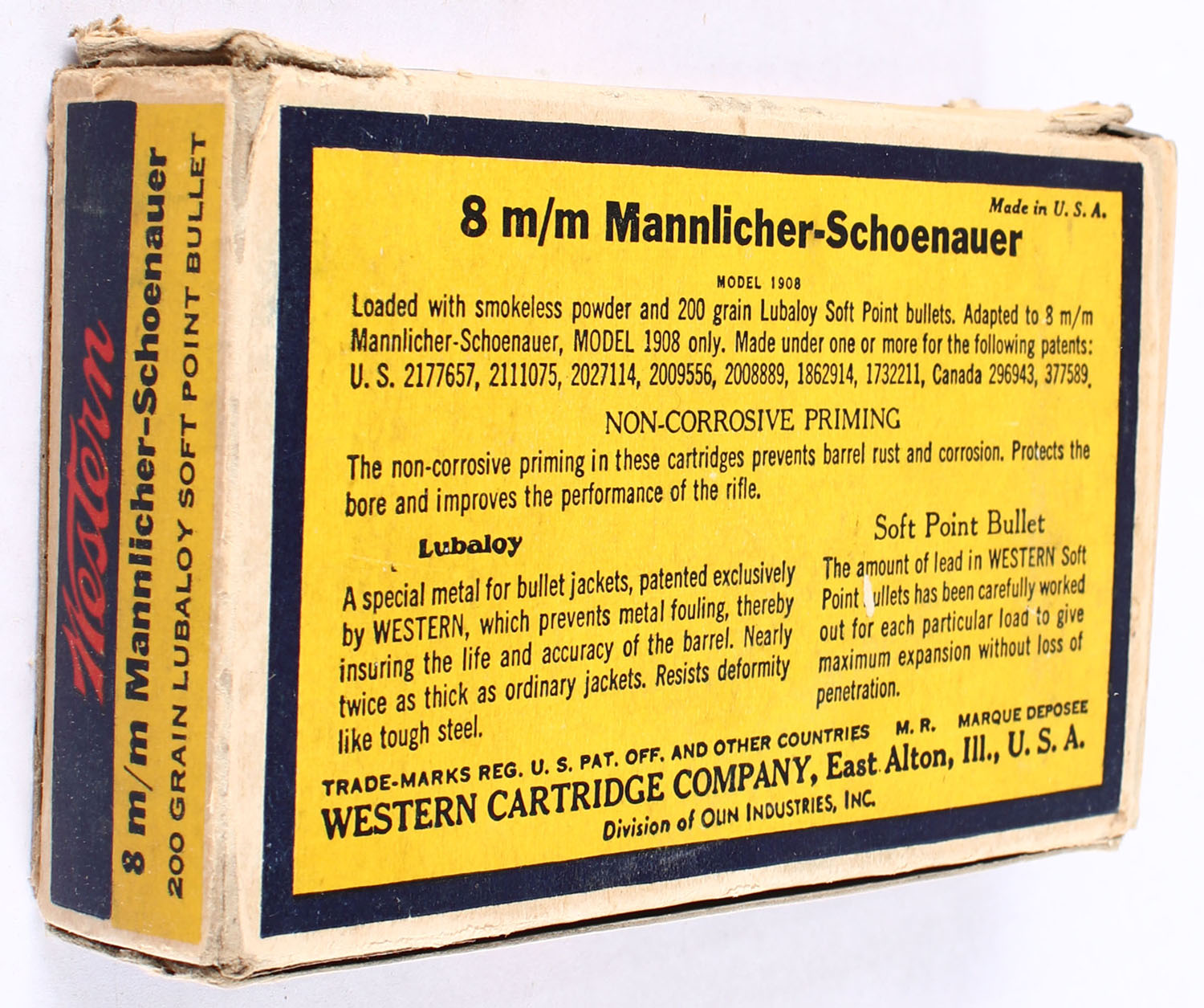 Western, Lubaloy Cartridges, 8mm Mannlicher-Schoenauer, 200 Grain Soft Point Bullet, Full, 1pc. Yellow blue & red bulls eye box, box has scuffing with edge & corner wear, has missing inside flaps, end flaps have a partial seam split, ammo is excellent. Grade: Very Good - Value: 30 to 45