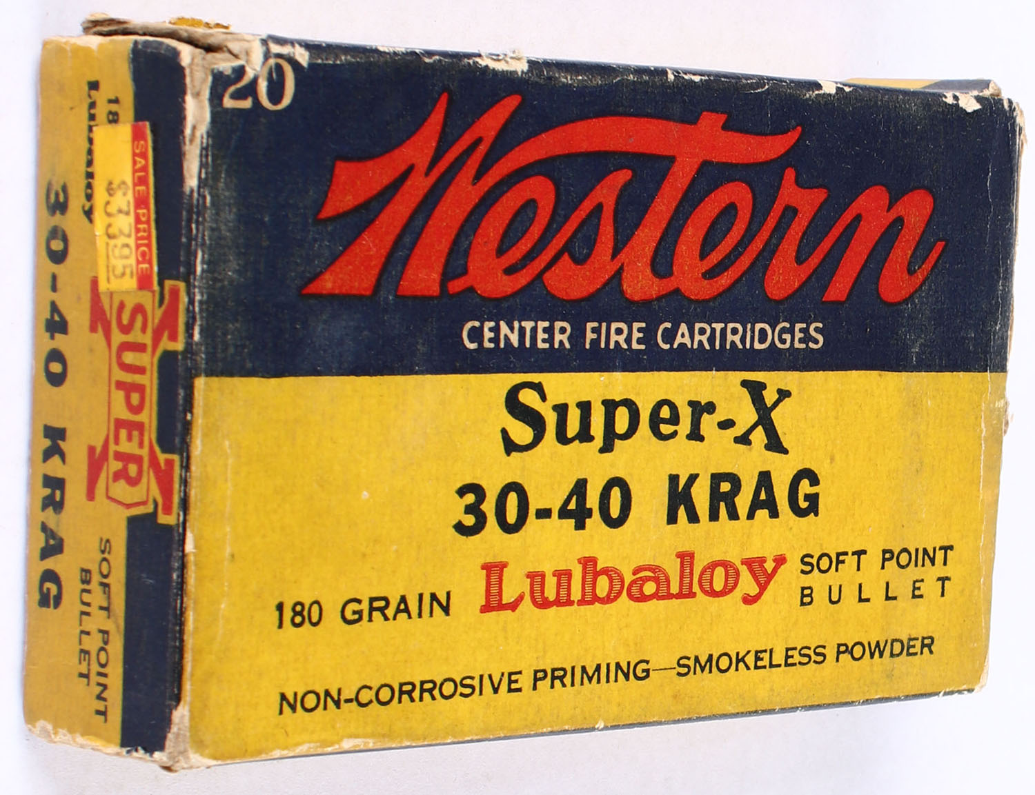 Western, Super-X, .30-40 Krag, 180 Grain Soft Point Lubaloy Bullet, Full with 19rds being correct, 1pc. Yellow blue & red box, box has shelf wear & corner wear, has scuffing with inside flaps missing, ammo is very good. Grade: Very Good - Value: 30 to 45