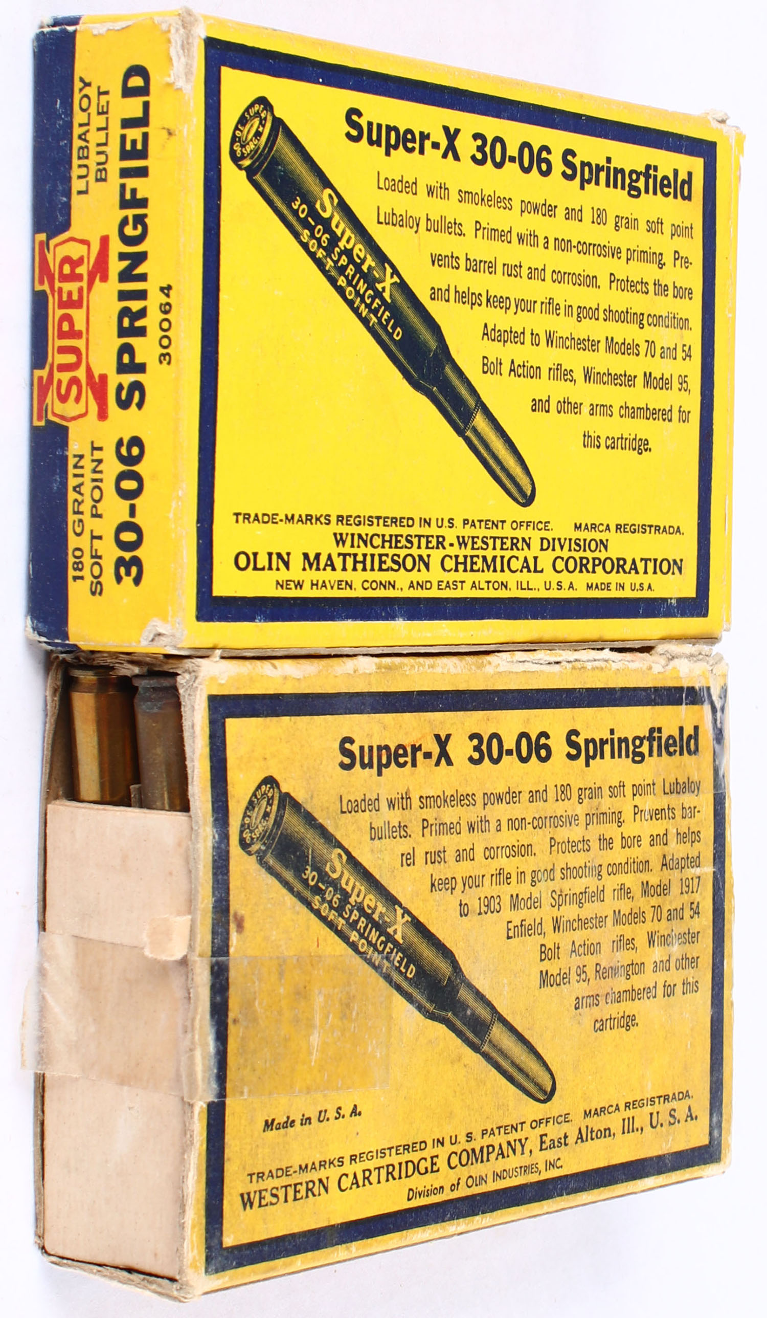 Western, Lot of (2), Super-X, .30-06 Springfield, 180 Grain Soft Point, Full with 30rds. Being correct, 1pc. Yellow blue & red boxes, (1) box very solid, (1) box has edge & corner wear with tape repairs and missing end flap, ammo is very good. Grade: Very Good - Value: 40 to 60