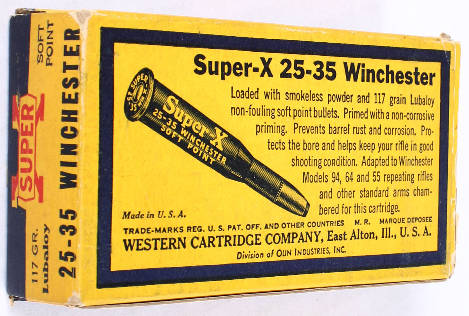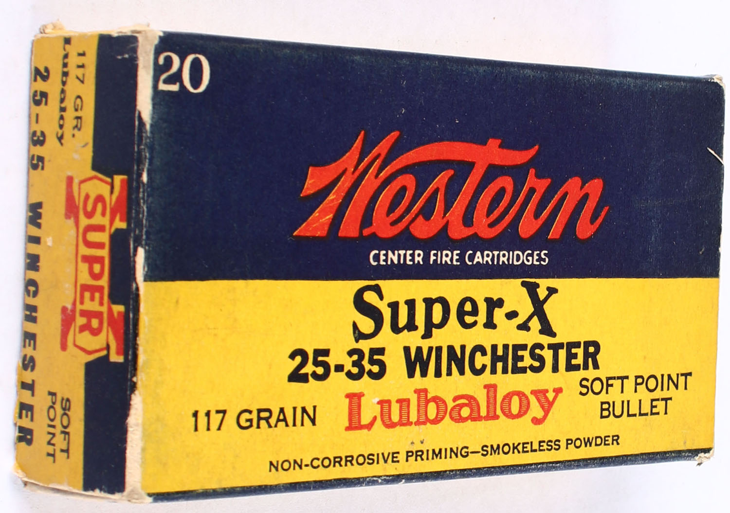 Western, Super-X, .25-35 Winchester, 117 Grain Soft Point Lubaloy Bullet, Full, 1pc. Yellow blue & red box, box is solid with excellent color, very minor corner wear, edges are mostly crisp, end flaps are solid, ammo is excellent. Grade: Excellent + - Value: 50 to 75