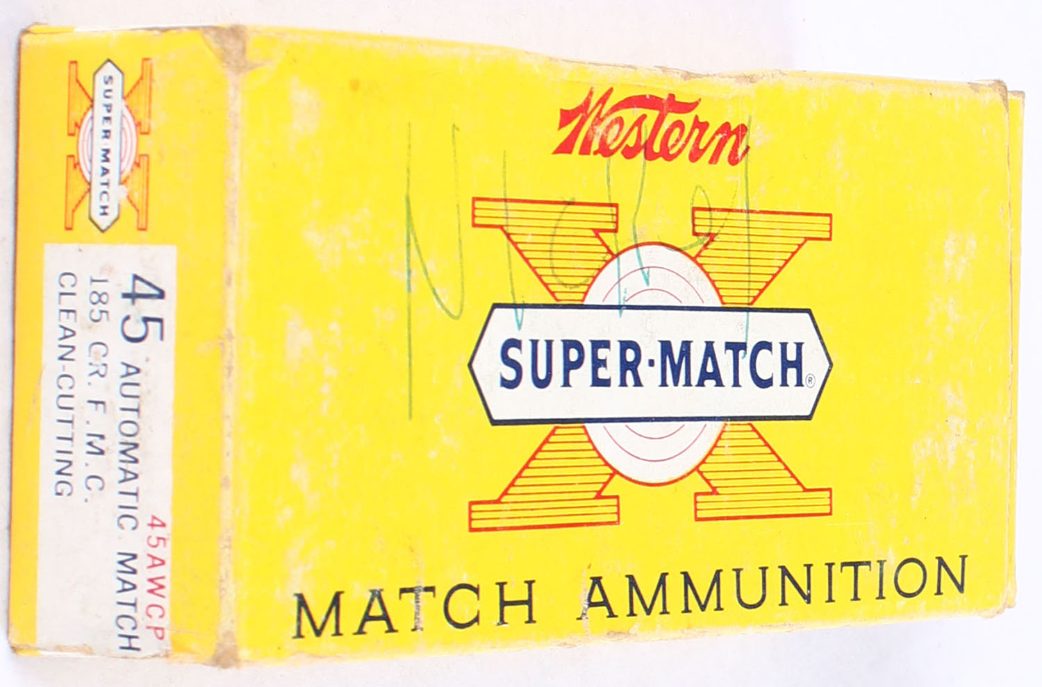 Western, Super-Match, .45 Automatic, 185 Grain Full Metal Clean-Cutting, Full, 1pc. Yellow white & red box, box has scuffing with light edge & corner wear, end flaps are solid, ammo is excellent to minty. Grade: Very Good ++ - Value: 24 to 36