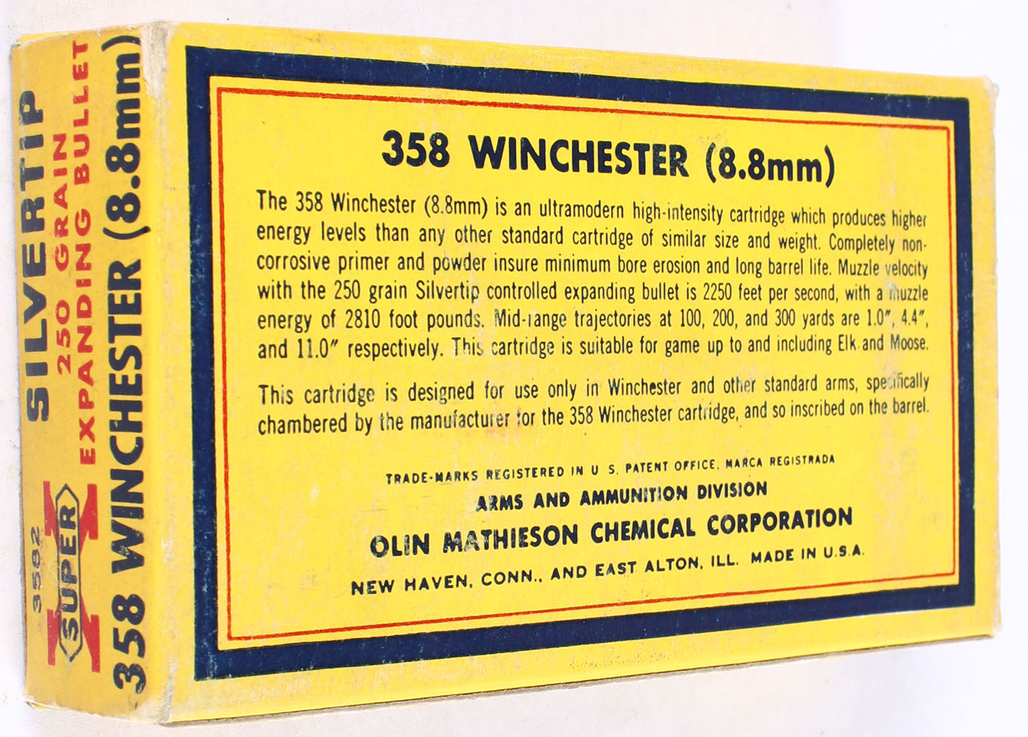 Western, Super X Silvertip, .358 Winchester (8.8mm), 250 Grain Controlled Expanding Bullet, Full, 1pc. Yellow blue & red box, box is very solid with excellent color, end flaps are solid, ammo is excellent. Grade: Excellent + - Value: 60 to 90