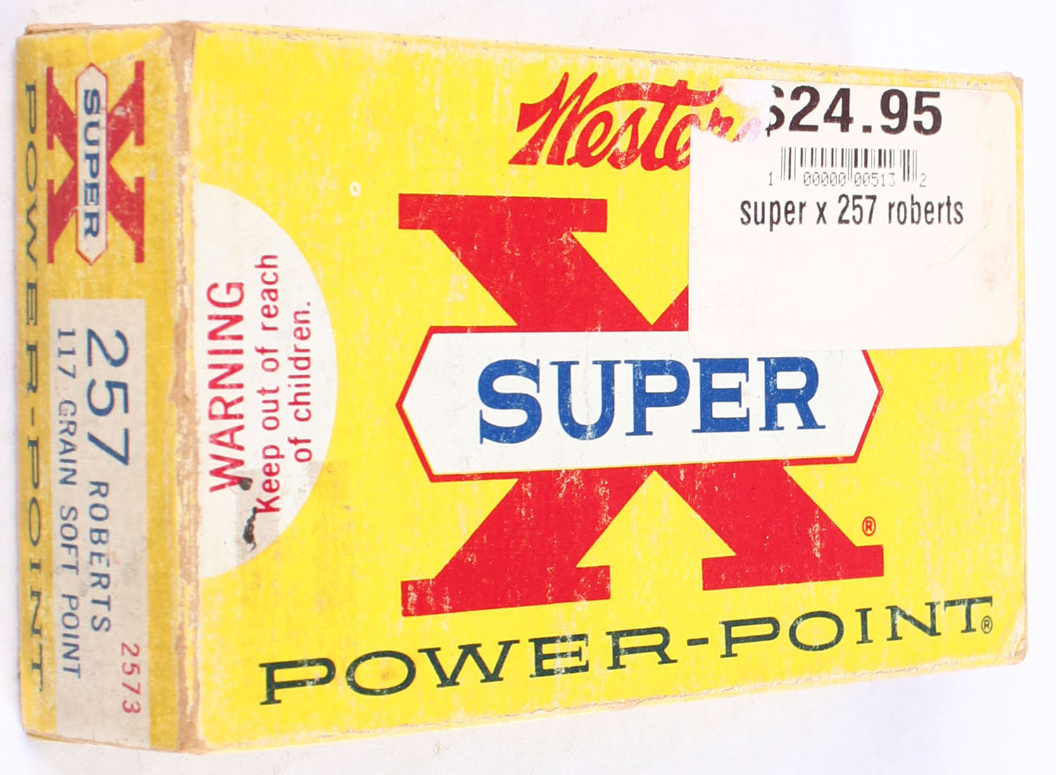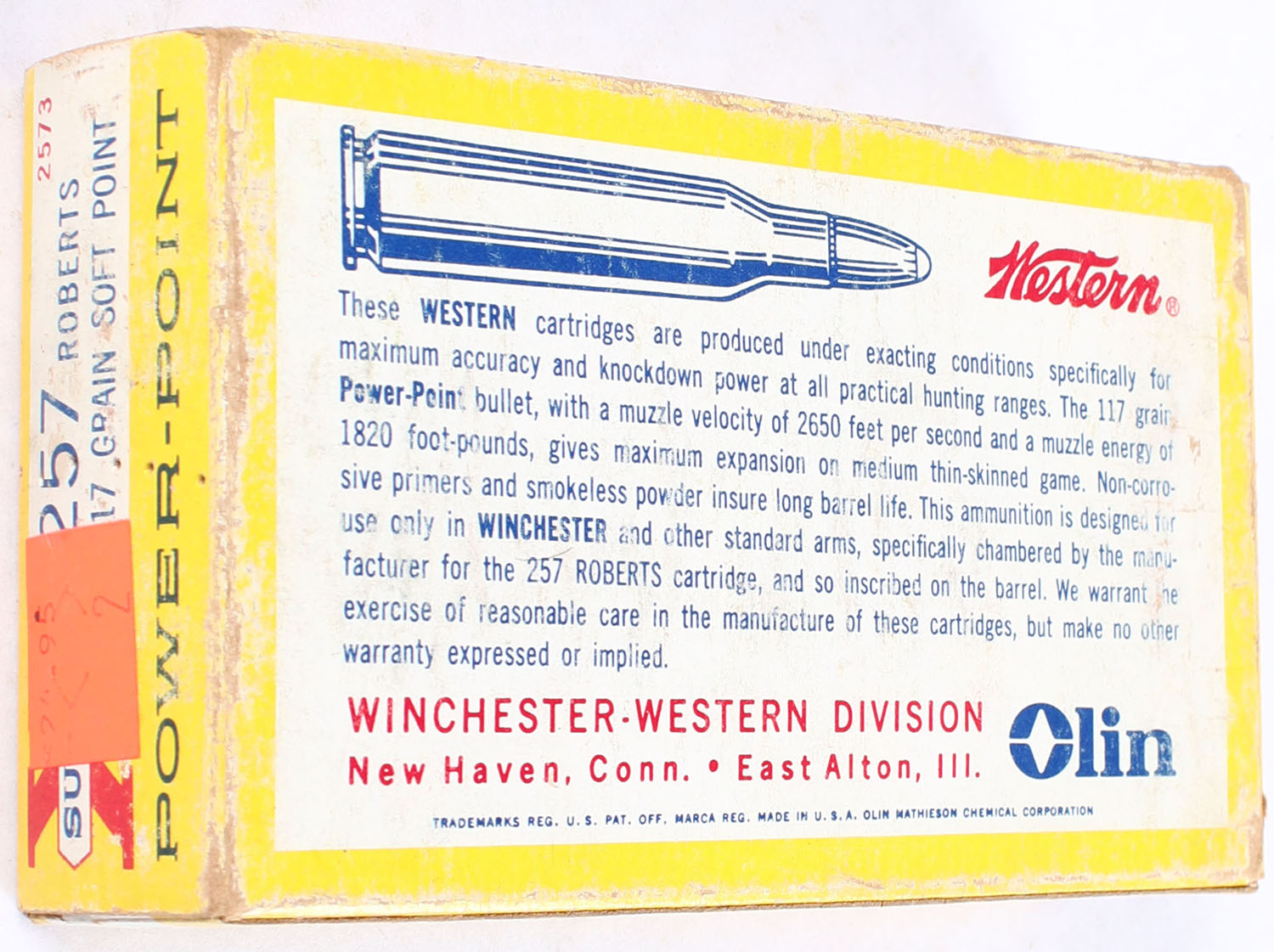 Western, Super-X Power-Point, .257 Roberts, 117 Grain Soft Point, Partial 18rds, 1pc., Yellow white & red box, box has age soiling with edge wear, has sticker to front, end flaps are solid, ammo is excellent. Grade: Very Good - Value: 24 to 36
