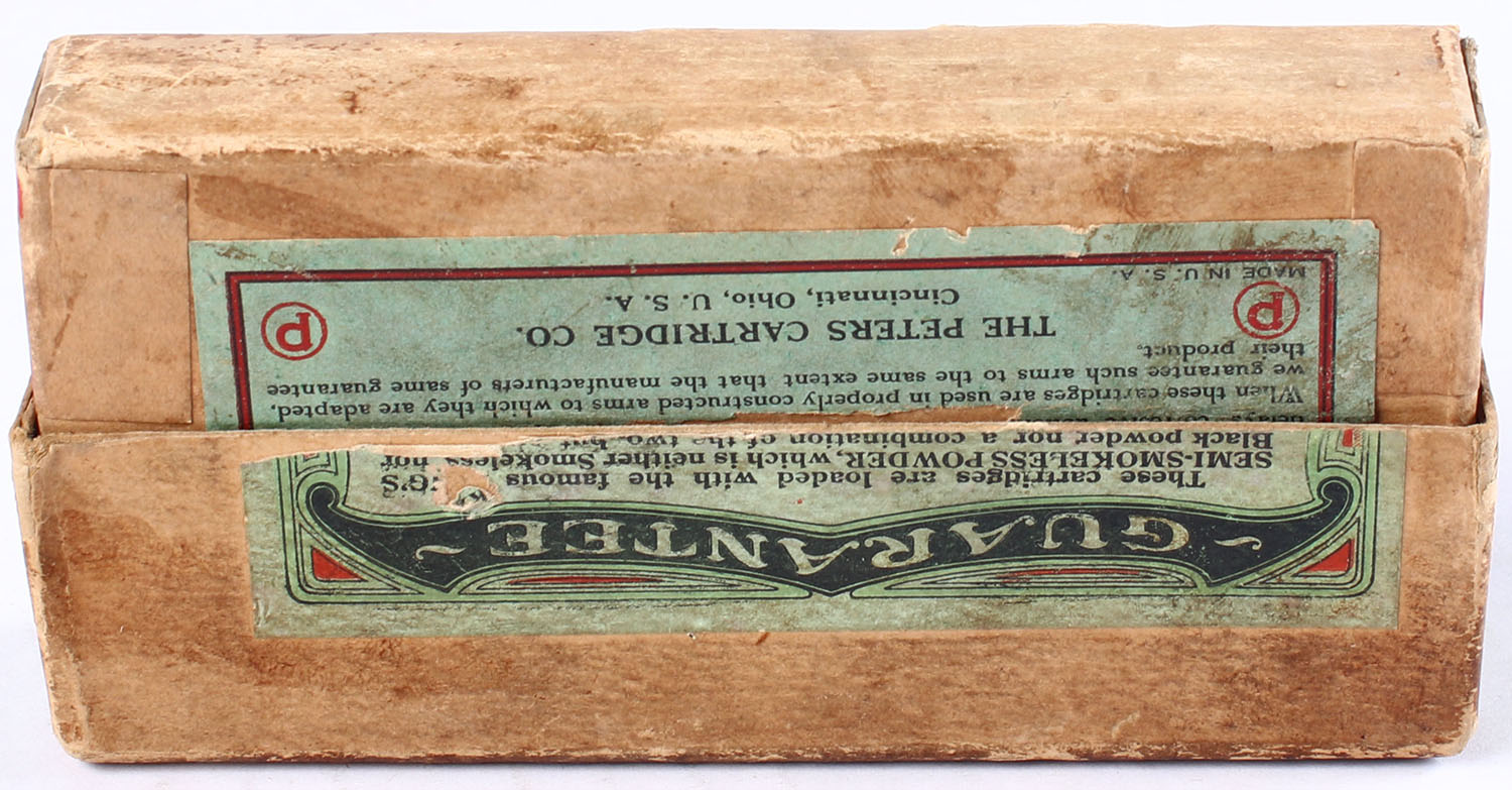 Peters, Central Fire Rifle Cartridges, .32-40, 165 Grain, 2pc. Full of correct H/S & cast bullets, Buff box with green side labels, box has age soiling with edge & corner wear, labels are intact, ammo is very good. Grade: Good ++ - Value: 60 to 100