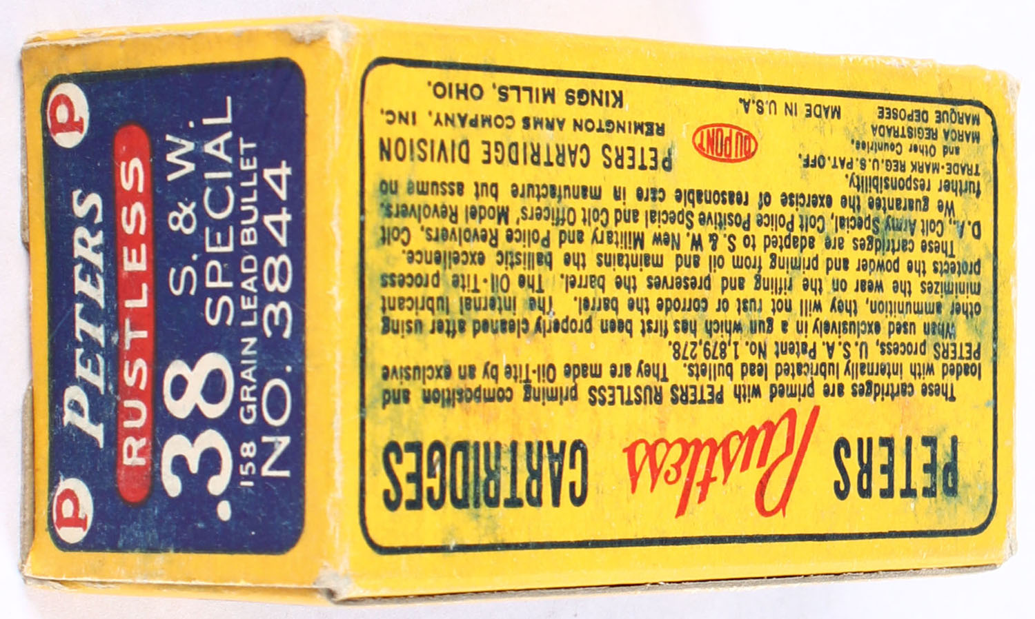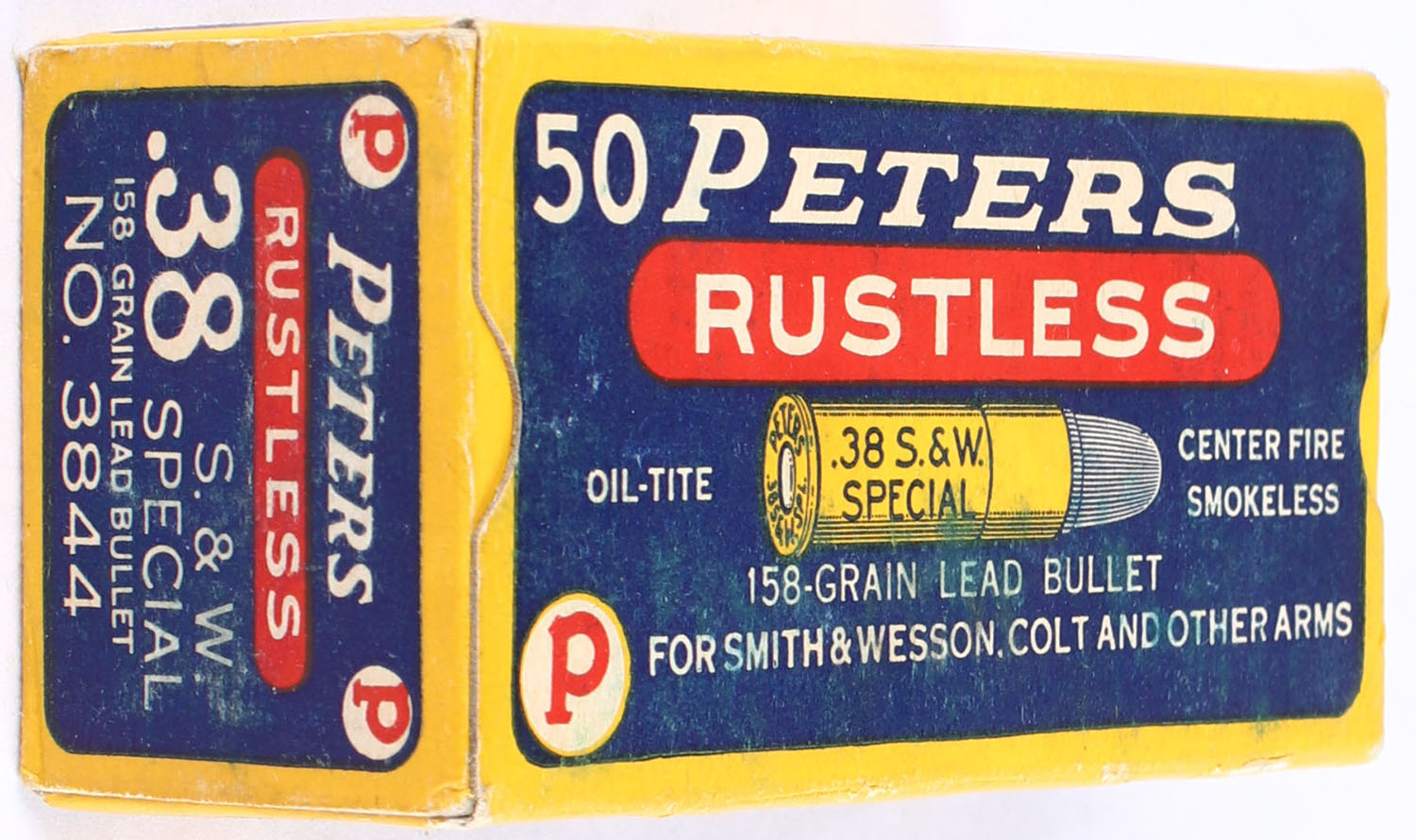 Peters, Rustless, .38 Smith & Wesson Special, 158 Grain Lead Bullet, Full, 1pc. Blue yellow & red box, box is solid with excellent color, minor shelf wear, very minor edge wear, end flaps are solid, ammo is excellent. Grade: Excellent - Value: 40 to 60
