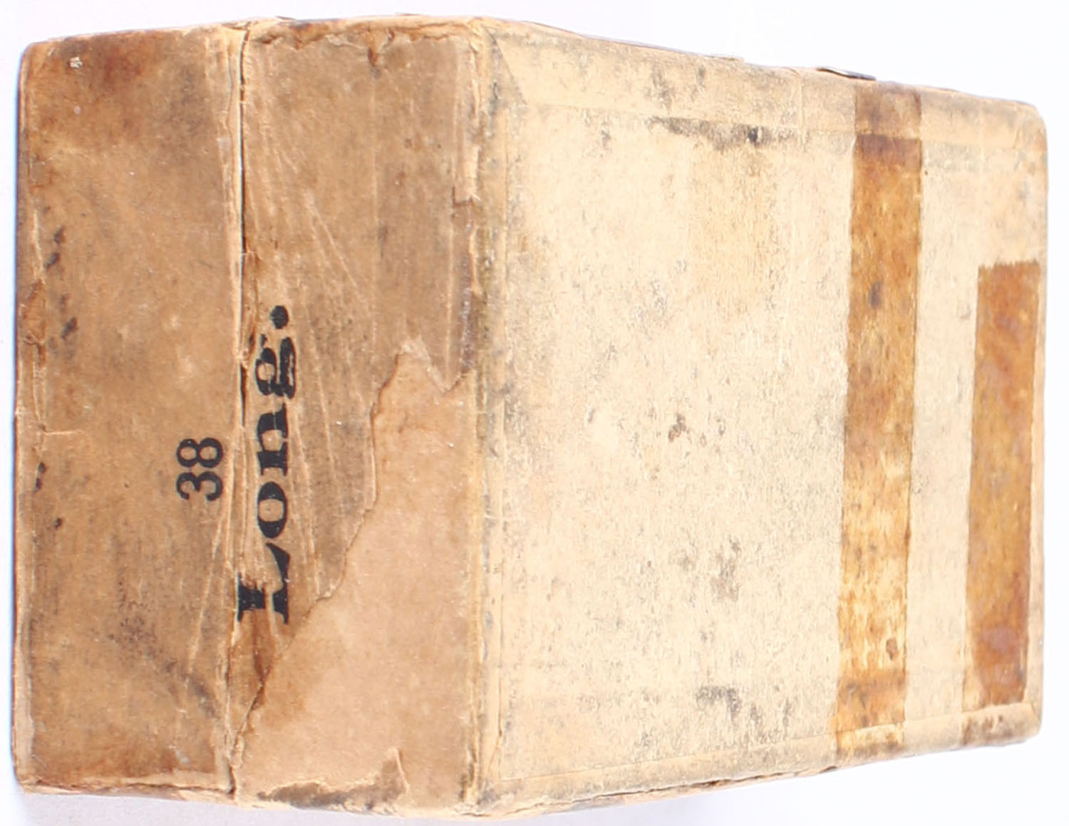 U.S., Metallic Cartridges, .38 Long Rim Fire, Target Cartridges, Full, 2pc. Buff box with green top & buff side sealing labels, box is solid with excellent color, has light age soiling & scuffing, edge & corner wear, labels are intact, ammo is very good. Grade: Very Good ++ - Value: 60 to 100
