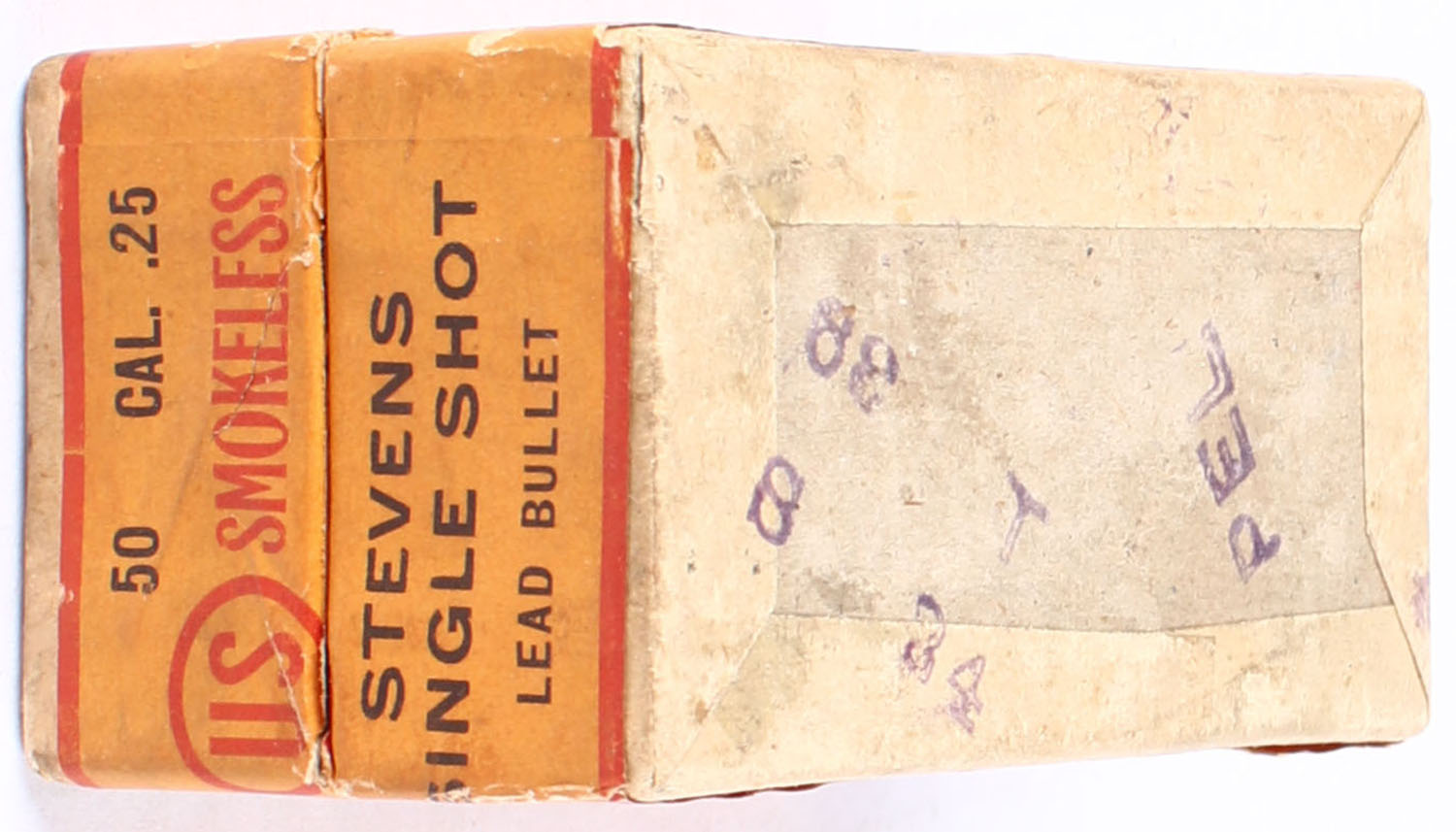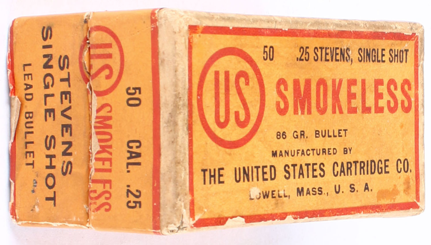 U.S. Smokeless Central Fire Cartridges, .25-20 Stevens, 86 Grain Bullet, Full, 2pc. Buff box with Orange & red label, box is very solid good color, has minor age soiling with edge & corner wear, label is intact, ammo is excellent. Grade: Very Good + - Value: 60 to 100