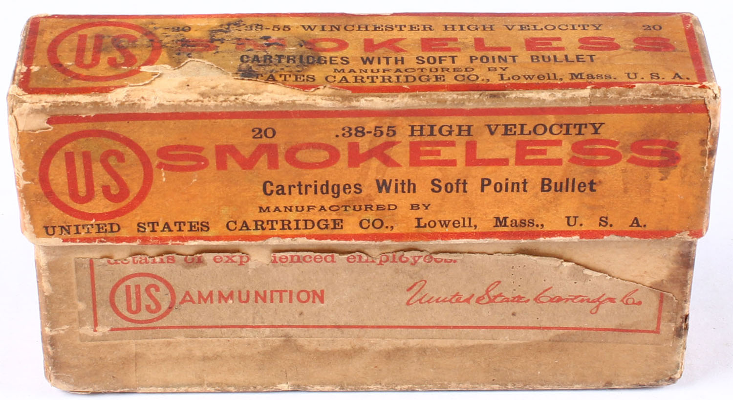 U.S., Smokeless Central Fire Cartridges, .38-55 Winchester High Velocity, Soft Point Bullets, Full, 2pc. Buff box with orange & red label, box has scuffing with soiling, has edge & corner wear, label is 90% intact, ammo is fair. Grade: Good + - Value: 20 to 60