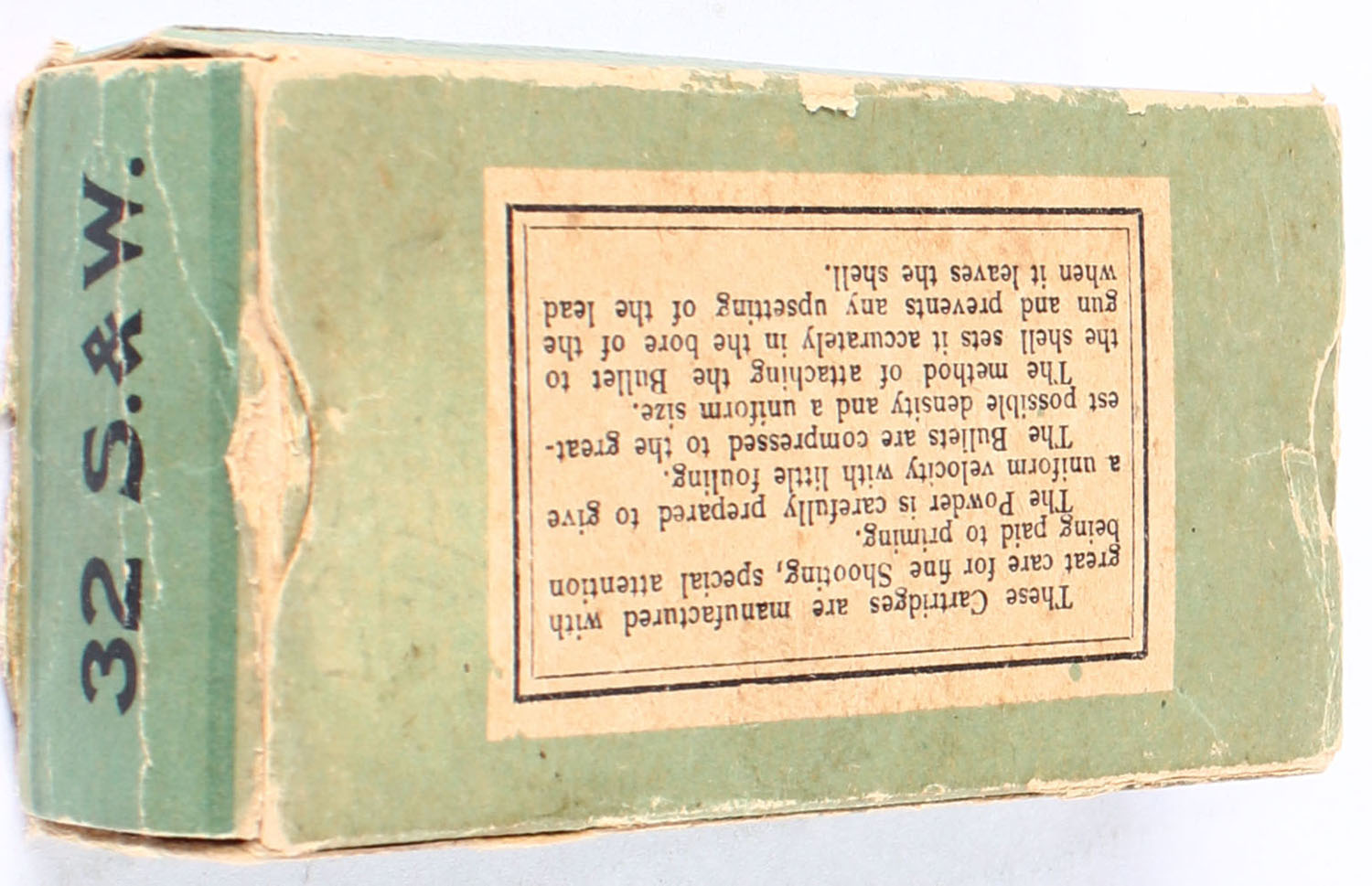 U.S., Central Fire Cartridges, .32 Smith & Wesson, Full, 1pc. Buff black & green box, box is solid with very good color, some age soiling & shelf wear, edge & comer wear, end flaps are solid, ammo is excellent. Grade: Very Good - Value: 20 to 40
