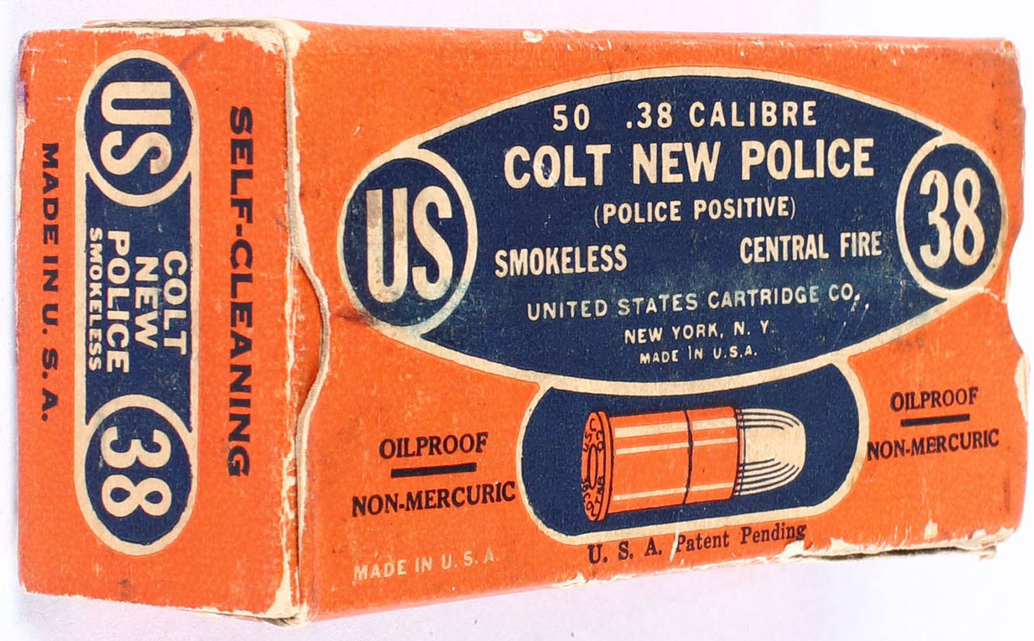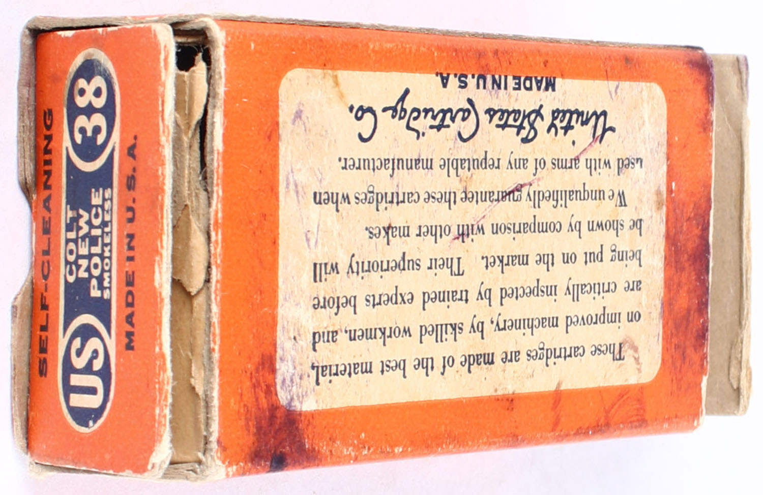 U.S., Smokeless Central Fire, .38 Colt New Police, Partial 35rds., 1pc. Orange blue & white box, box has torn end flaps, edge & corner wear, light age soiling, ammo is very good. Grade: Good + - Value: 10 to 40