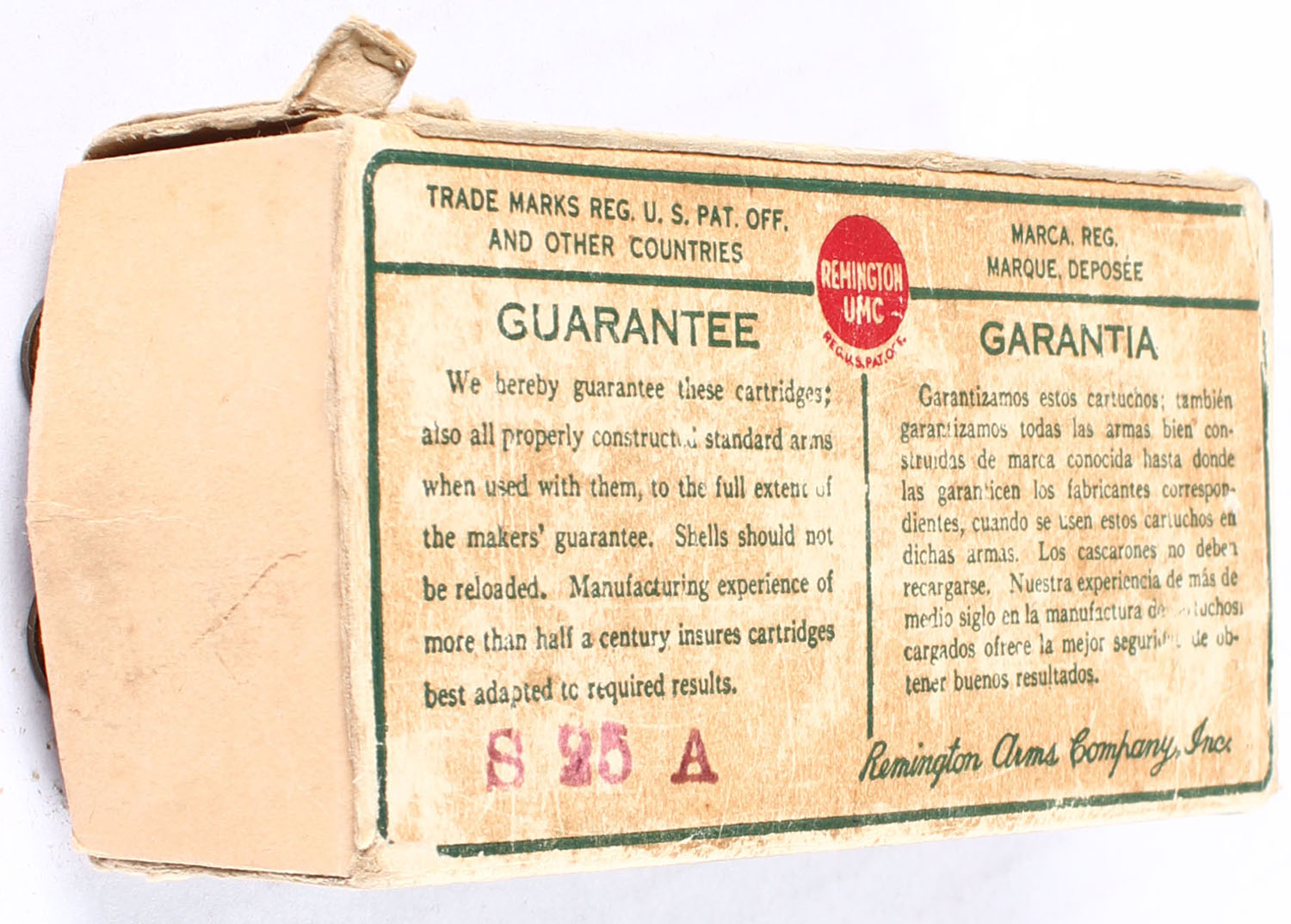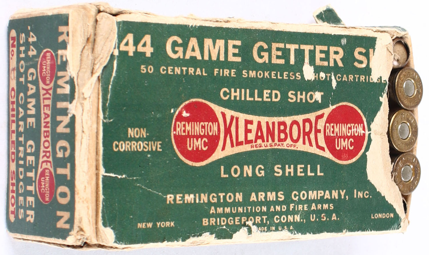 Remington, Kleanbore, .44 GAME GETTER, Long Shell, Full with 46rds. Being correct, No.8 Chilled Shot, 1pc. Green white & red dog bone box, box is missing right end flap, has age soiling, edge & corner wear, ammo is good. Grade: Good ++ - Value: 100 to 400