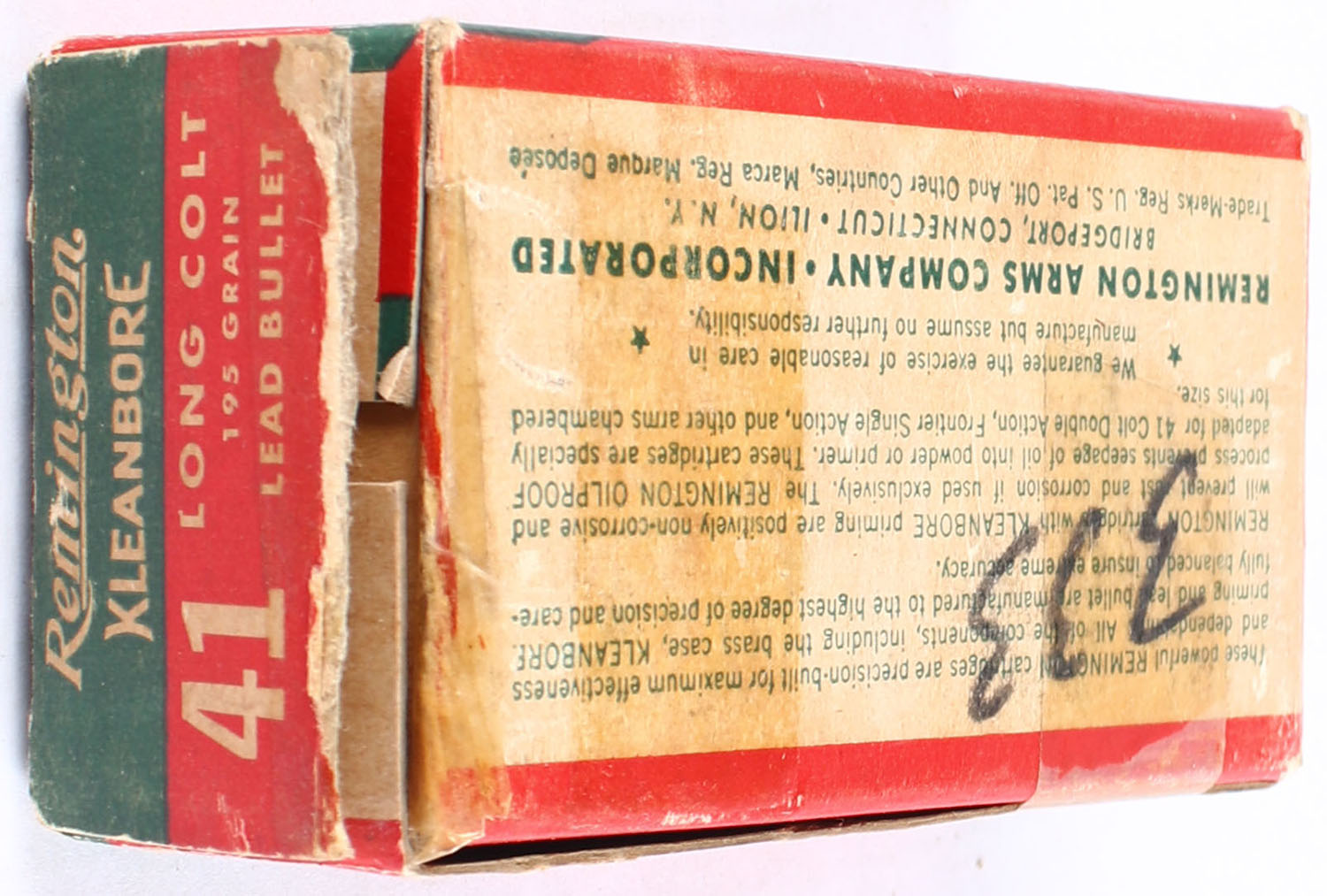 Remington, Kleanbore, .41 Long Colt, 195 Grain Lead Bullet, Full, 1pc. Green white & red box, box is solid with very good color, minor age soiling & color fading, some tape repair, some edge & corner wear, right end flap is torn, ammo is excellent. Grade: Very Good - Value: 60 to 180