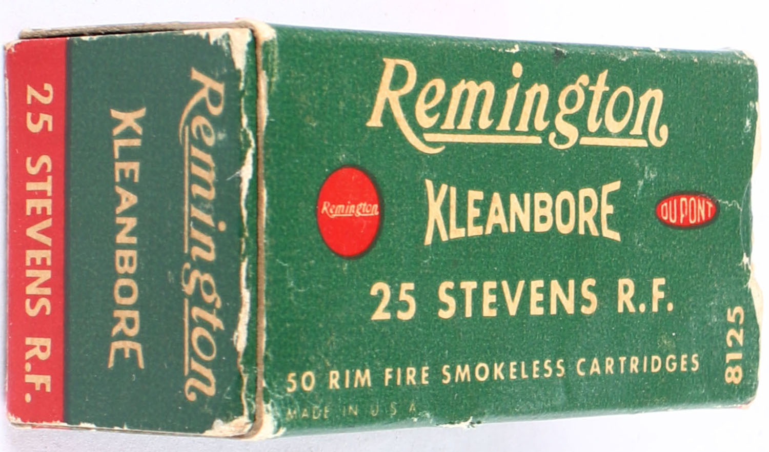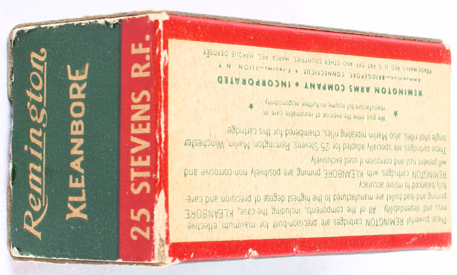 Remington, Kleanbore, .25 Stevens Rim Fire, Smokeless, Full, 1pc. Green white & red box, box has edge & corner wear with scuffing, ammo is excellent, end flaps are solid. Grade: Very Good ++ - Value: 50 to 150