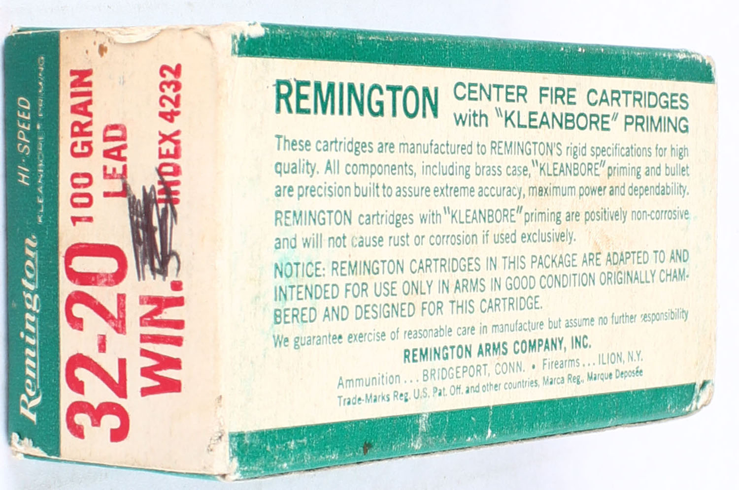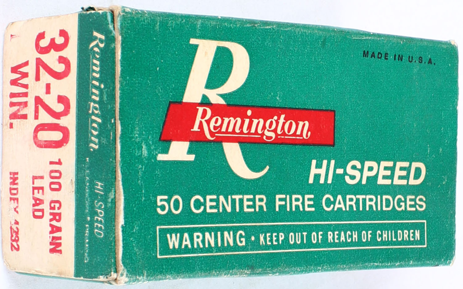 Remington, Hi-Speed, .32-20 Winchester, 100 Grain Soft Point, Full, 1pc. Green white & red box, box is solid with excellent color, has corner wear & scuffing, edges are crisp, end flaps are solid, ammo is excellent. Grade: Very Good ++ - Value: 50 to 120