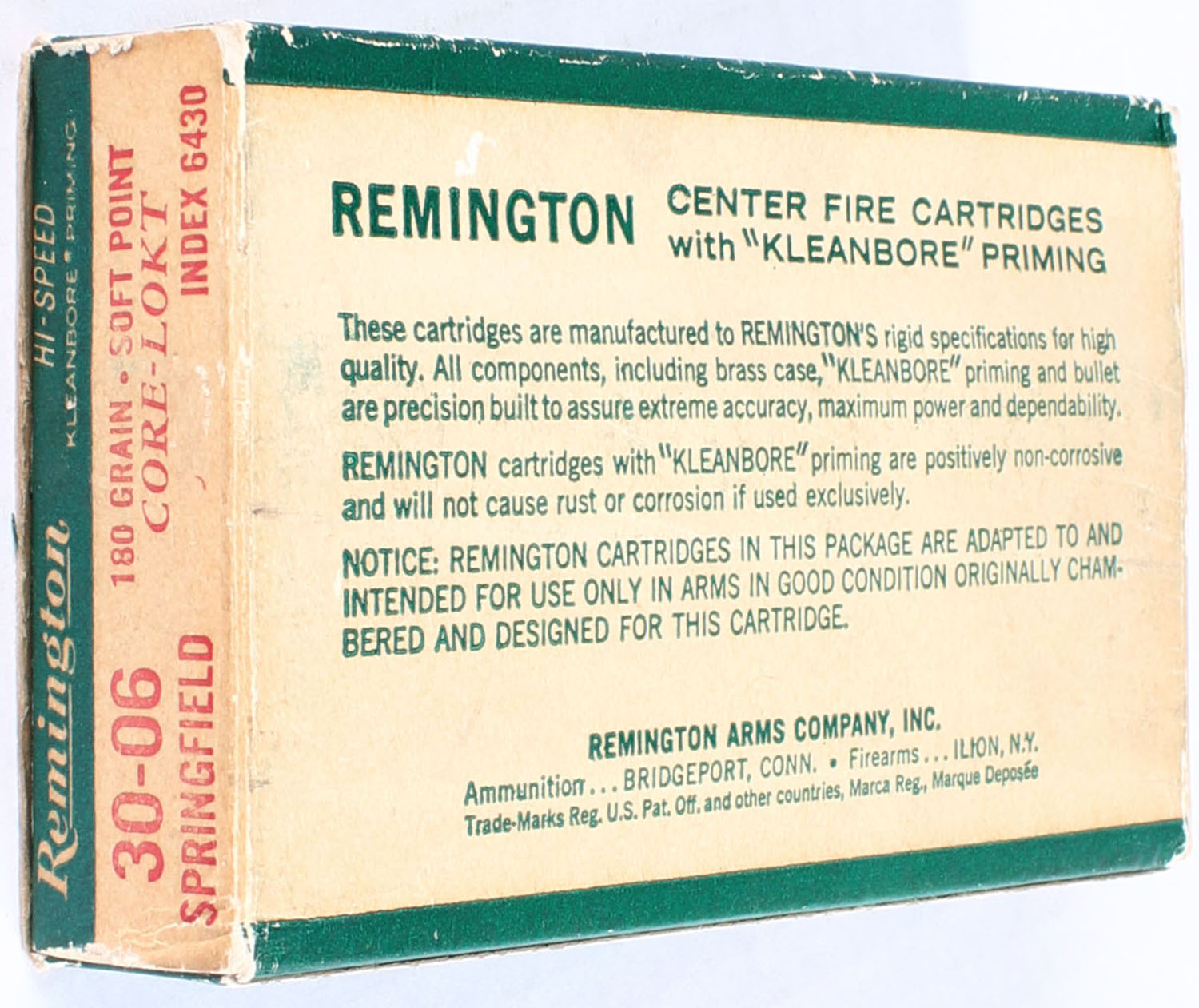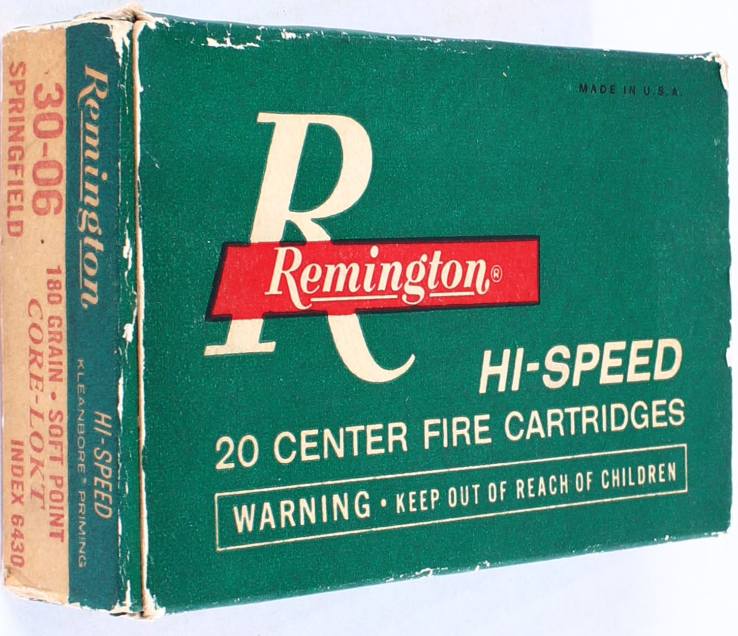 Remington, .30-06 Springfield, 180 Gr. PTD Soft point Core-Lokt Bullet, 1pc, Full, Green white & red box, box is solid with light rub marks & minor edge wear, ammo is excellent. Grade: Excellent - Value: 16 to 40