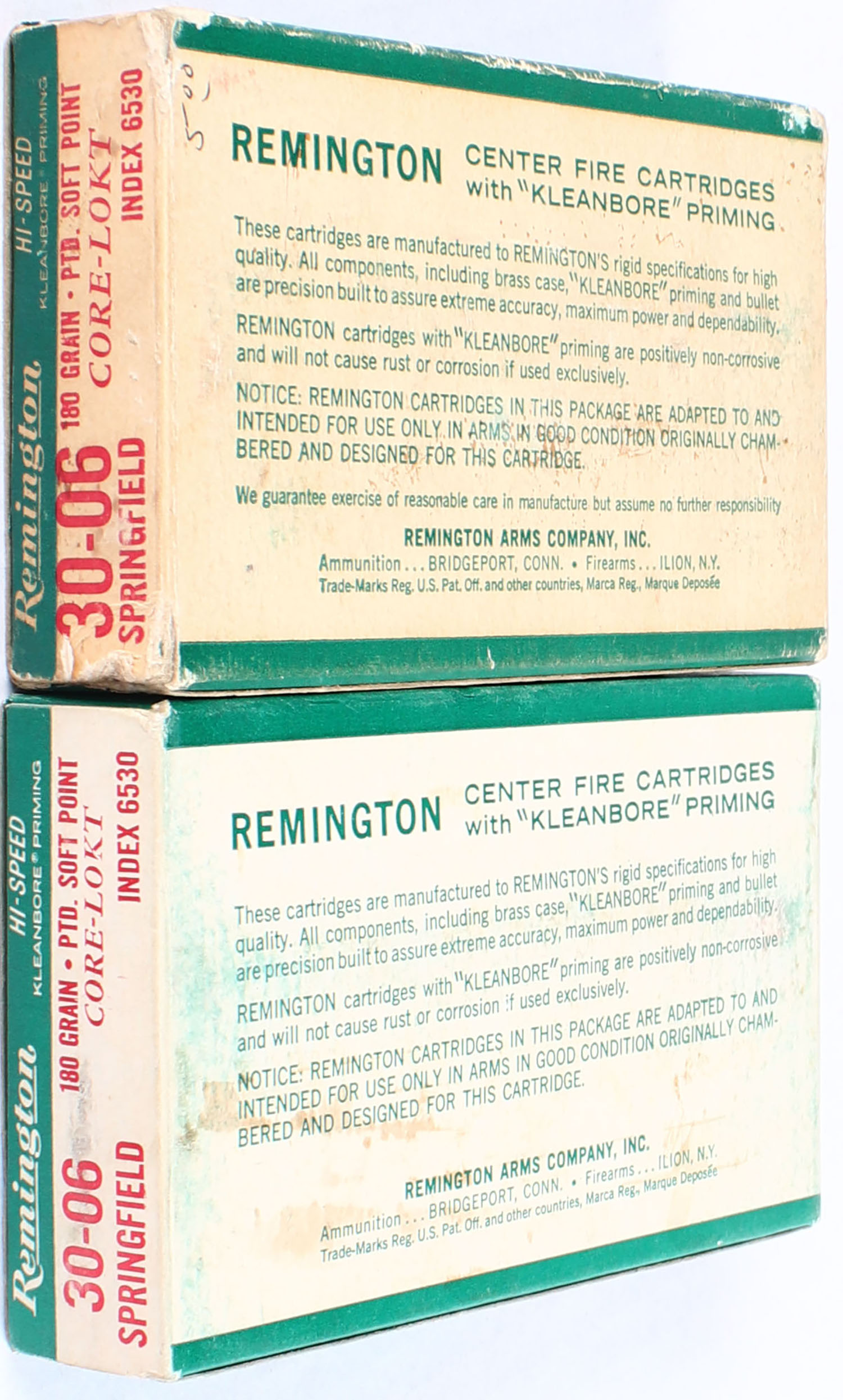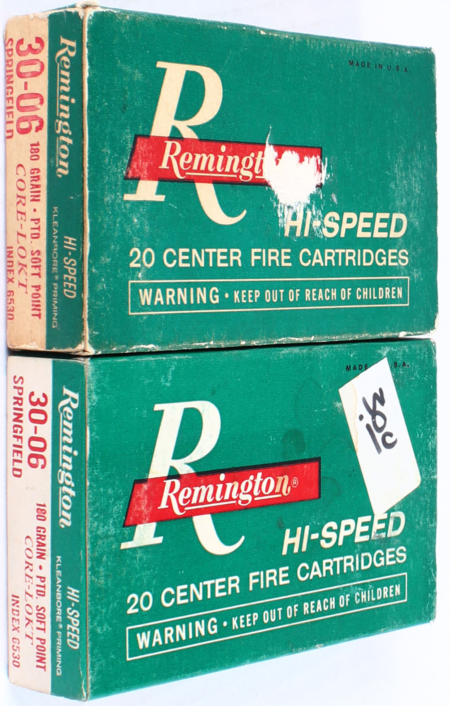 Lot of 2 Remington, .30-06 Springfield, 180 Gr. PTD Soft point Core-Lokt Bullet, 1pc, Full, Green white & red box, box is solid with light rub marks & minor edge wear, ammo is excellent. Grade: Excellent - Value: 30 to 60