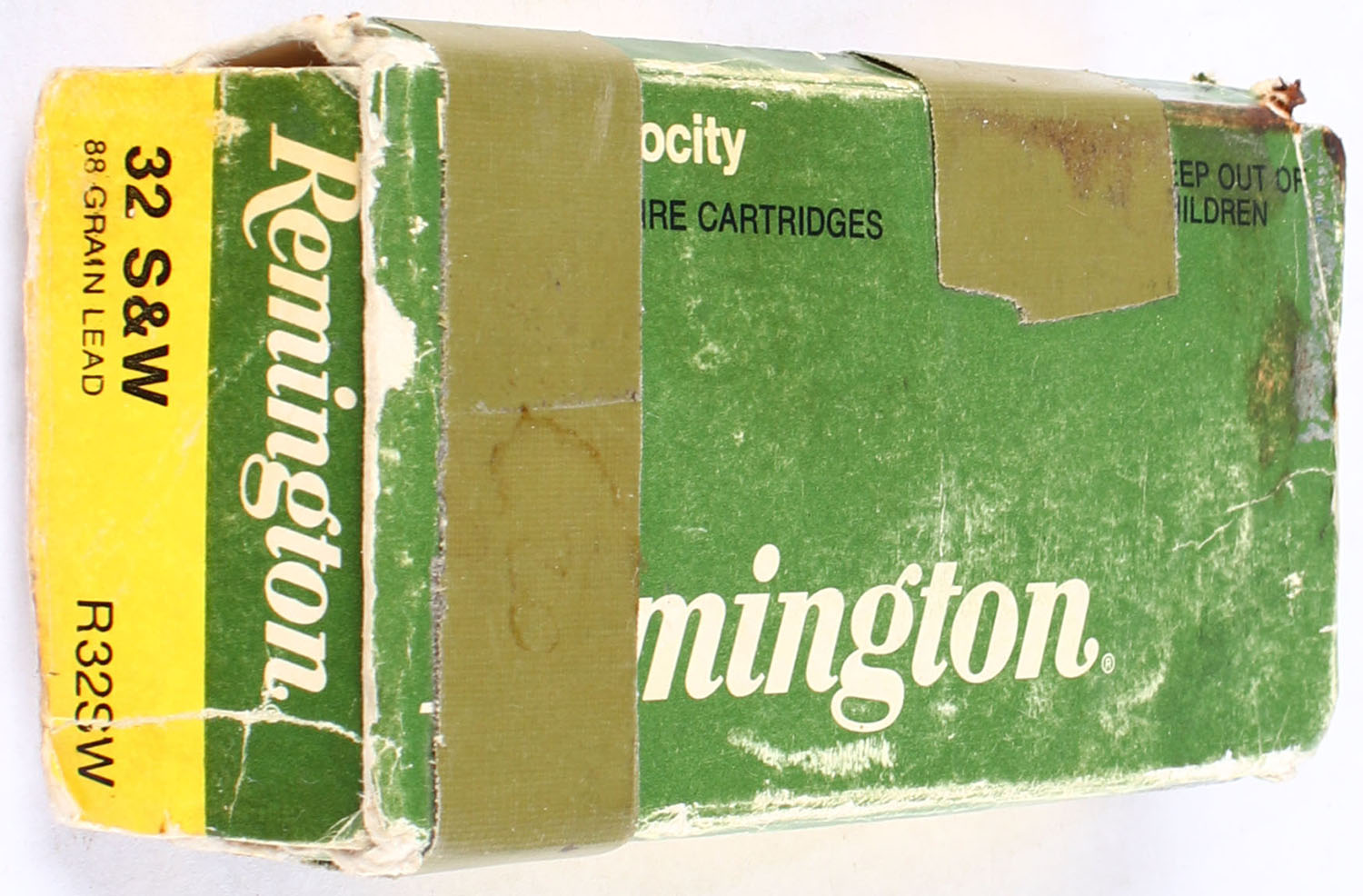 Remington, High Velocity, .32 S&W, 88 grain lead, Partial 43 rds., 1pc. Green & yellow box, box has one torn flap, tape and scuffing, ammo is excellent. Grade: Good ++ - Value: 10 to 50