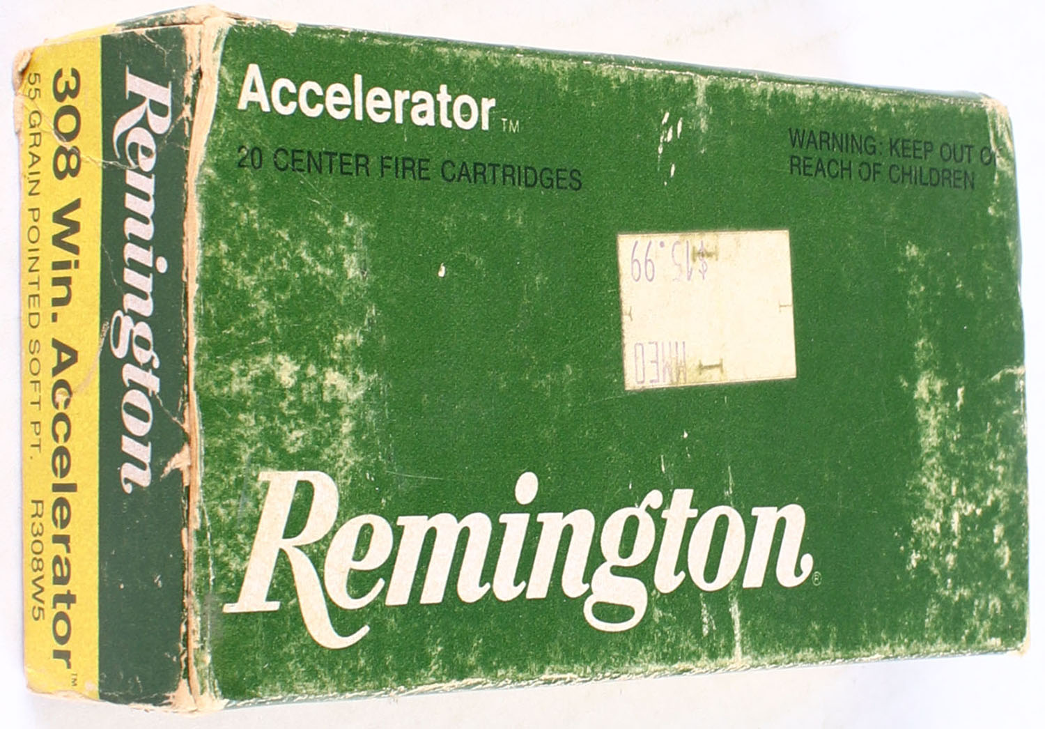 Remington, Accelerator, .308 Win., 55 Gr. Pointed Soft Point, 1pc, Full, Green & yellow box with white/black print, box has edge & corner wear, ammo is excellent. Grade: Very Good ++ - Value: 40 to 80