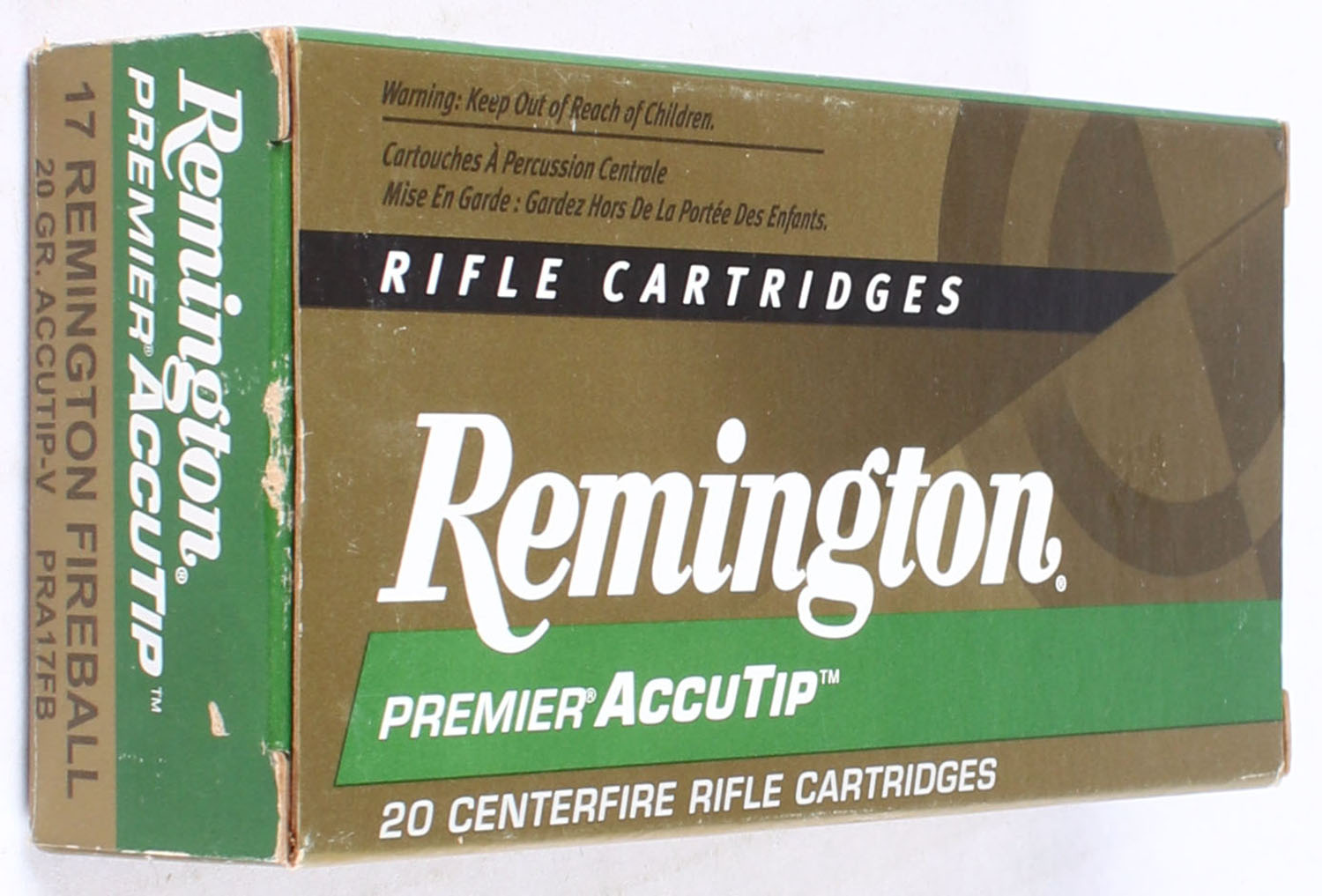 Remington, Premier AccuTip, .17 Remington Fireball, 20 Grain Accutip-V, multi-colored box, box is very solid, edges are crisp, end flaps are solid, ammo is excellent. Grade: Excellent ++ - Value: 20 to 40