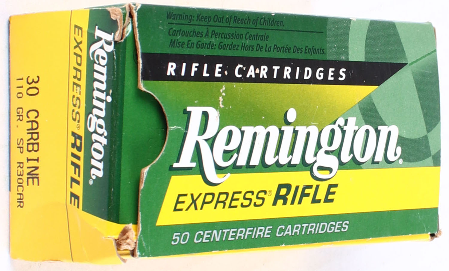 Remington, Express Rifle, .30 Carbine, 110 Gr. SP, Full, 1pc., Multi-colored box, box is solid, ammo is excellent. Grade: Excellent - Value: 16 to 40