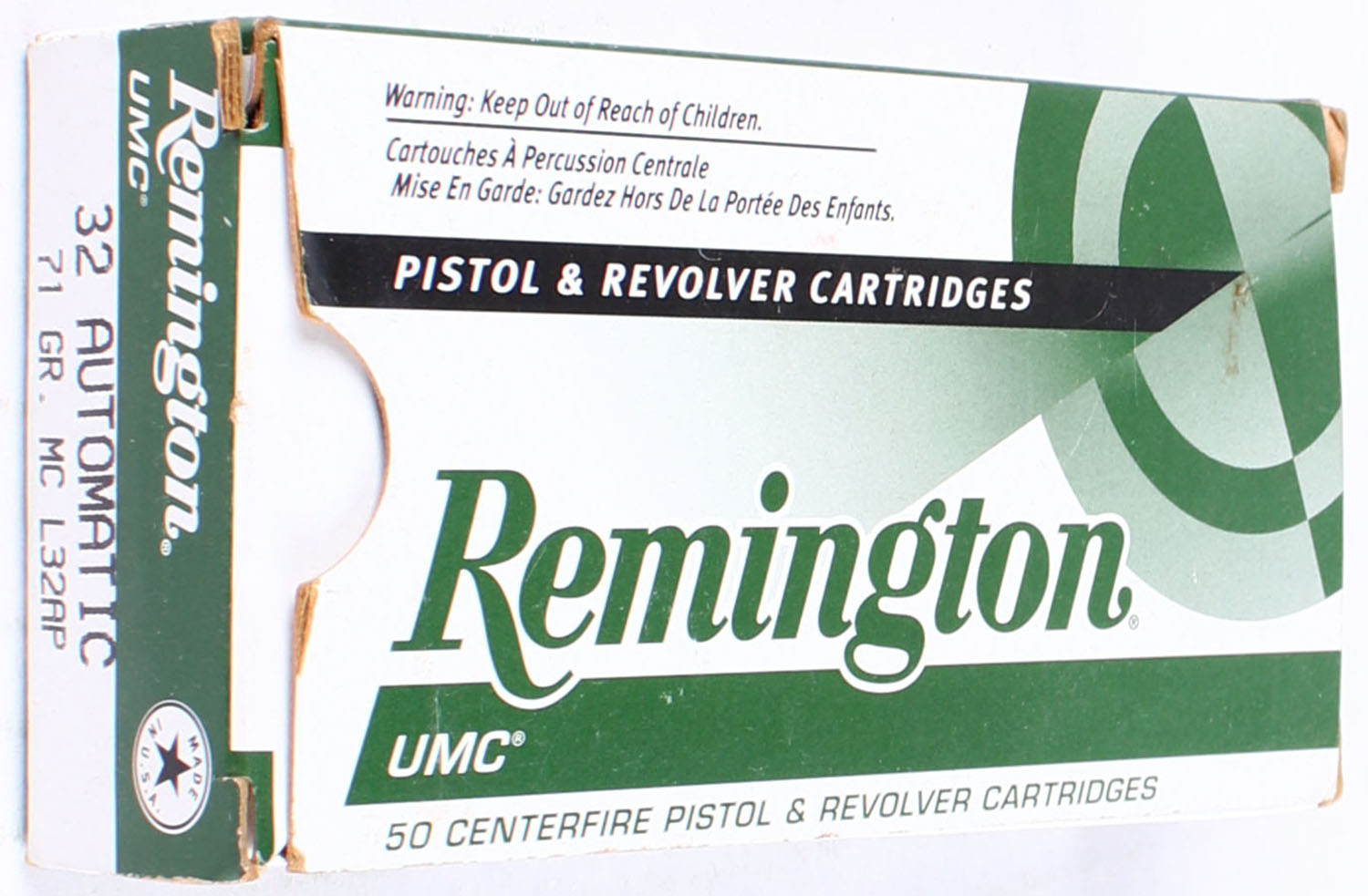 Remington, UMC, .32 Auto, 71 Grain Metal Case, Full, 1pc., green, white & black box, box is solid with great color, light corner wear, end flaps are solid, ammo is excellent. Grade: Excellent - Value: 10 to 40