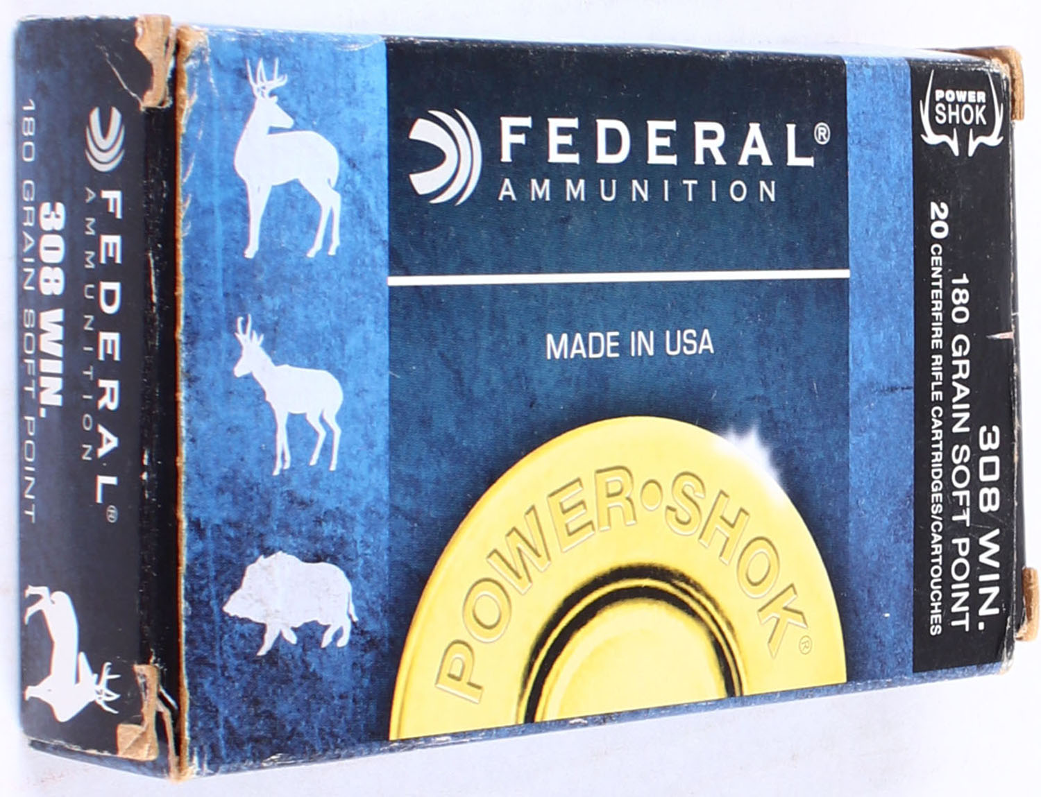 Federal, Power Shok, .308 Win., 180 Grain Soft Point, Full, 1pc., multi-colored box, box has edge wear, ammo is excellent. Grade: Excellent - Value: 16 to 50
