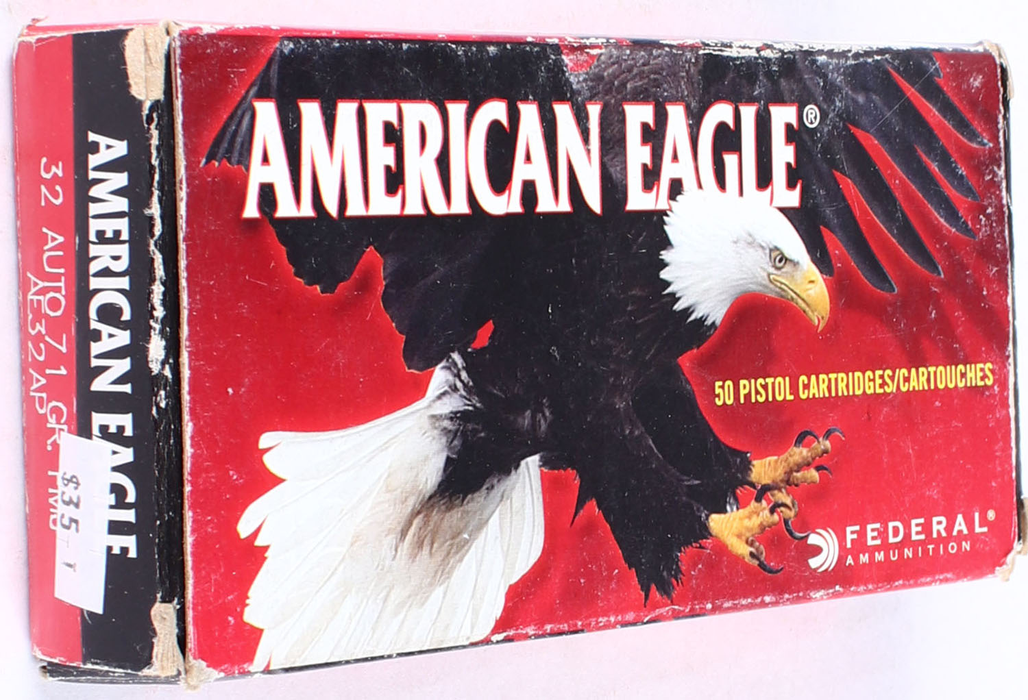 Federal, American Eagle, .32 Auto, 71 Grain FMJ, Full, 1pc. Multi-colored box, box has scuffing and edge wear, end flaps are solid, ammo is excellent. Grade: Excellent - Value: 10 to 30