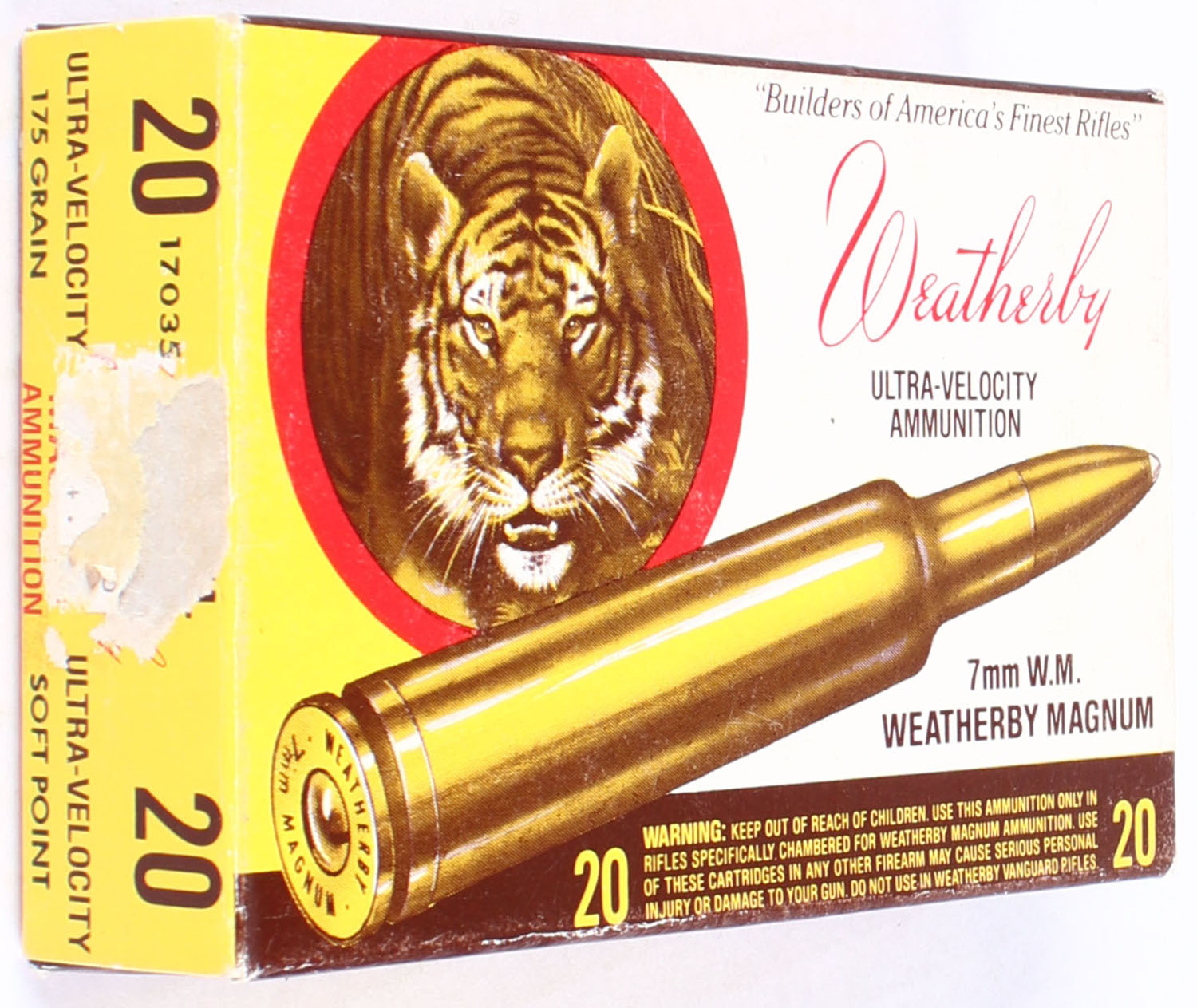 Weatherby, Ultra-Velocity Ammunition, 7mm WM., 175 Grain Soft Point, Full, 1pc., multi-colored Tiger box, box is solid with very good color, some scuffing, end flaps are solid, ammo is excellent. Grade: Excellent + - Value: 36 to 70