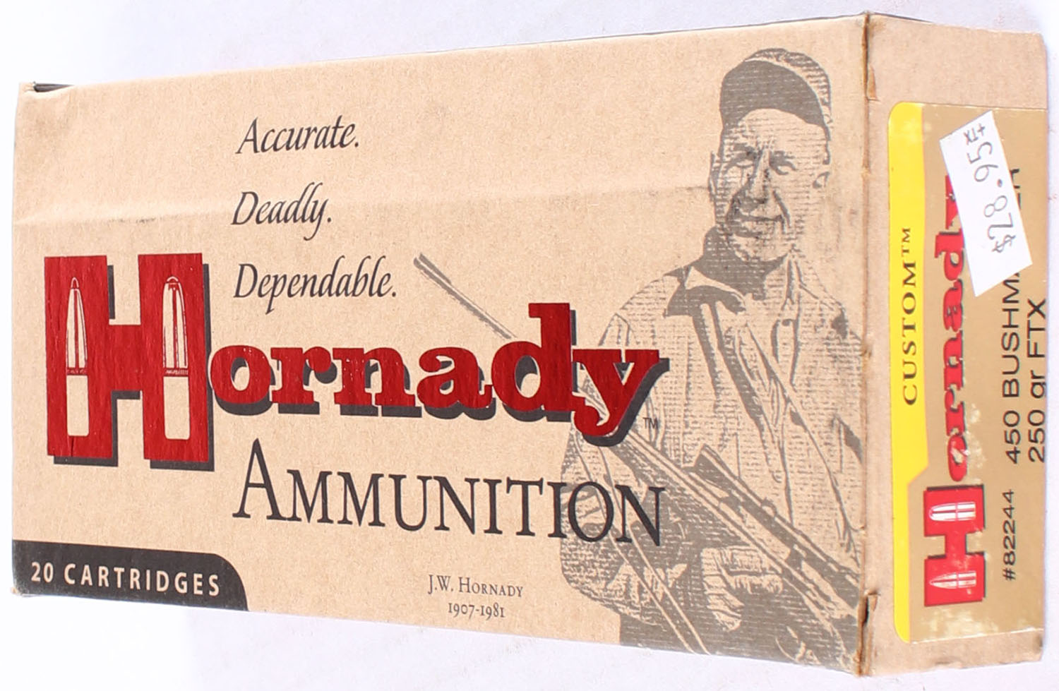 Hornady, Custom, 450 Bushmaster, 250 Grain FTX, Full, 1pc. multi-colored box, box has conformed around inside tray maybe got wet once and dried tightly around inside tray, Ammo is excellent. Grade: Excellent - Value: 20 to 50
