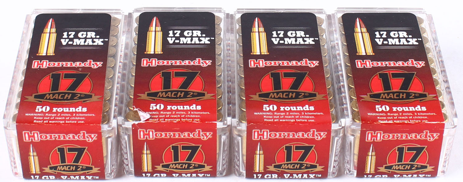 Lot of (4) Hornady, MACH 2, 17 Grain V-Max, FULL & SEALED, 50 rds each or 200 total rounds. 1pc. Multi-colored boxes, boxes are solid with excellent color, Ammo is excellent. Grade: Excellent ++ - Value: 20 to 50