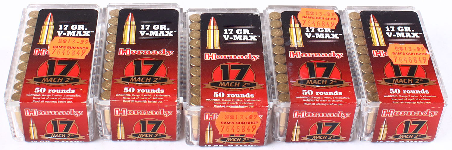 Lot of (5) Hornady, MACH 2, 17 Grain V-Max, FULL & SEALED, 50 rds each or 250 total rounds. 1pc. Multi-colored boxes, boxes are solid with excellent color, Ammo is excellent. Grade: Excellent ++ - Value: 20 to 60