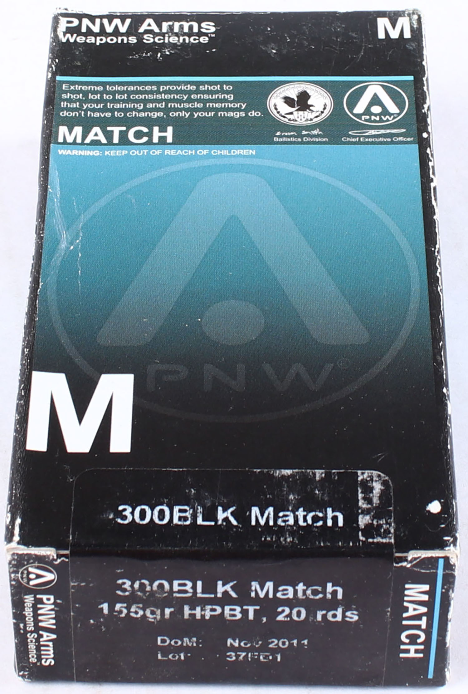 PNW Arms, .300 BLK Match, 155 Grain HPBT, Full, 1pc., Multi-colored box, box has shelf wear, ammo is excellent. Grade: Very Good - Value: 10 to 40